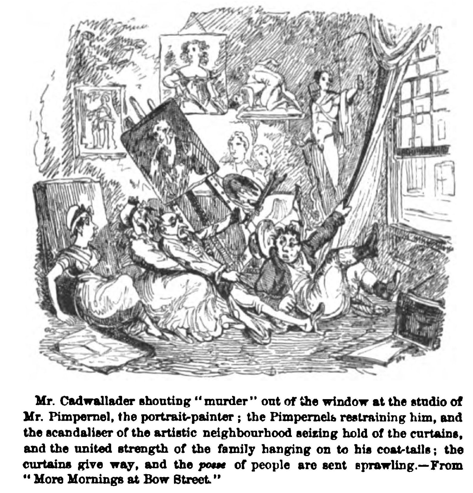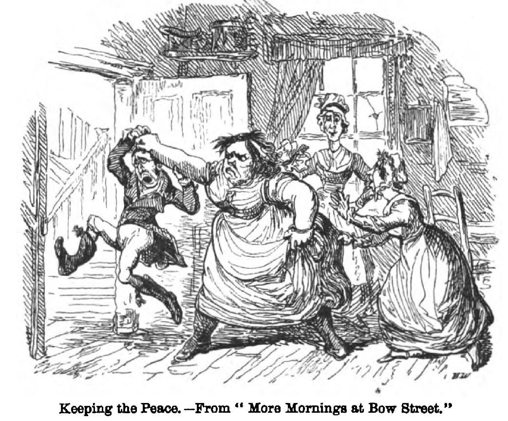 “‘If you’ll believe me, Mrs. Harris, I turned my head, and see the werry man a-making pictures of me on his thumb nail, at the winder! While another of em—a tall slim, melancholly gent, with dark hair, and a bage vice—looks over his shoulder, with his head o’ one side as if he understood the subject, and cooly says, ‘I’ve draw’d her several times—in Punch,’ he says too I The owdacious wretch.’”