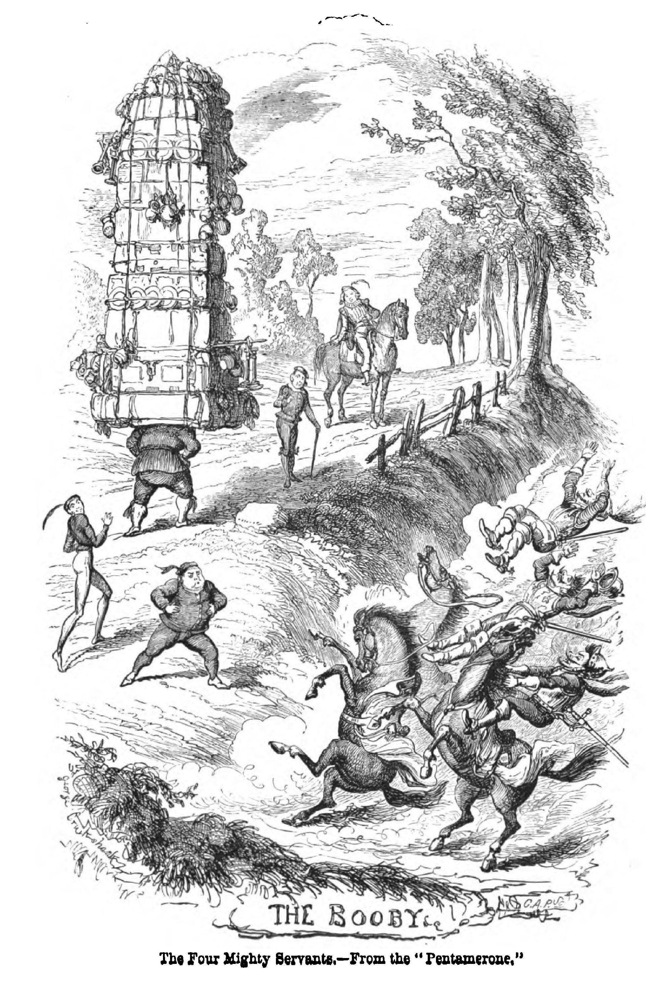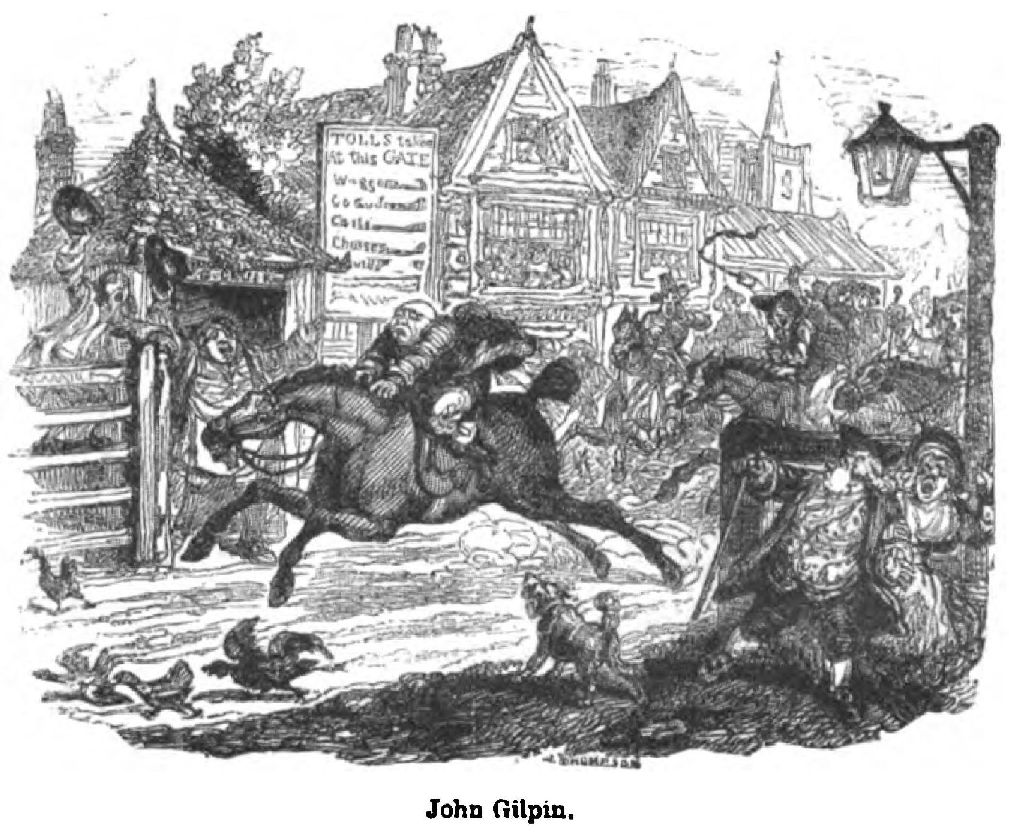 Between 1837 and 1847, in addition to his work with Dickens and Ainsworth, and in his Omnibus and “Comic Almanac,” Cruikshank threw off some of his most popular minor drawings and etchings. Within this decade he etched many of his plates for the “Waverley Novels,” he illustrated “Peter Parley’s Tales about Christmas,” “Rambles in the Footsteps of Don Quixote” (1837), “More Hints on Etiquette” (1838), “Lympsfield and its Environs” (1838), “The Life of Mansie Waunch (1838) for Blackwood, “Land-Sharks and Sea-Gulls” (1838), “Rejected Addresses” (1838), “Out and About,” a boy’s adventures, by Hain Friswell (1840), John O’Neill’s poem of “The Drunkard” (1842), Dibdin’s Songs (1841-2), “Picnic Papers” (1841), edited by Dickens; Douglas Jerrold’s “Cakes and Ale” (1842), “Modern Chivalry, or a new Orlando Furioso” (1843); Martin’s “Vagaries,” a sequel to “A Tale of a Tub” (1843); “The Bachelor’s own Book, or the Life of Mr. Lambkin, gent” (1844); Harry Lorrequer’s “Arthur O’Leary” (1844); Maxwell’s “Irish Rebellion” (1845), “The Old Sailor’s Jolly Boat” (1845), “The Comic Blackstone” (1846), Mrs. Gore’s “Snow-Storm” and “New Year’s Day” (1845), “Our Own Times” (1845), the Brothers Mayhew’s “Greatest Plague of Life” (1847), “The Emigrant,’ by Sir Francis Head, Captain Chamier’s “Ben Brace” (1847), “Nights at Mess,” and Laman Blanchard’s “Sketches from Life.” He also began his capital illustrations to “The Ingoldsby Legends,” in Bentley’s Miscellany. To this period, also, his wellknown “John Gilpin” and “Lord Bateman” (1839) belong.