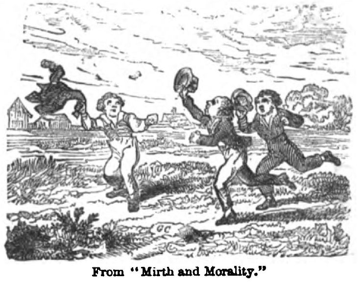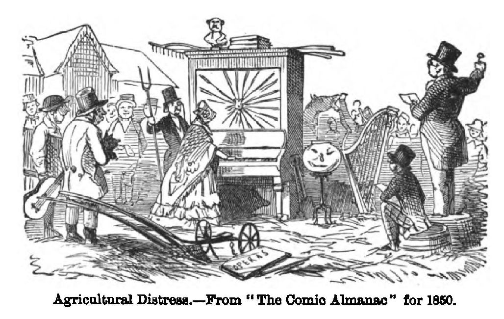 The fun of Mr. Rigdum Funnidos was of a kind that has found many imitators. In the “proceedings of learned societies” we find that the fossil remains of an antediluvian pawnbroker had been dug up within a mile of Hog’s Norton; that a successful method of converting stones into bread has been transmitted to the New Poor Law Commissioners, and a three-and-sixpenny medal presented to the ingenious discoverer thereof; then that a laborious investigator has reckoned that there are exactly nine millions, one hundred and sixty-four thousand, five hundred and thirty-three hairs on a tom-cat’s tail, which he defies all the zoologists of Europe to disprove. Later on (1839) Thackeray contributed “Stubbs’ Diary” and “Barber Cox, or the Cutting of his Comb,” to the pages of Funnidos. From the first, Cruikshank hit hard at quacks and shams. The first almanac has an “advertisement extraordinary” of the “British Humbug College of Health,” and some amusing testimonials from Gudgeon and Gosling, who have been cured by “Morising Pills.” The moral at the close of the almanac is, “While we venerate what is deserving of veneration, let us not forget that quackery, knavery, bigotry, and superstition always merit exposure and castigation.”