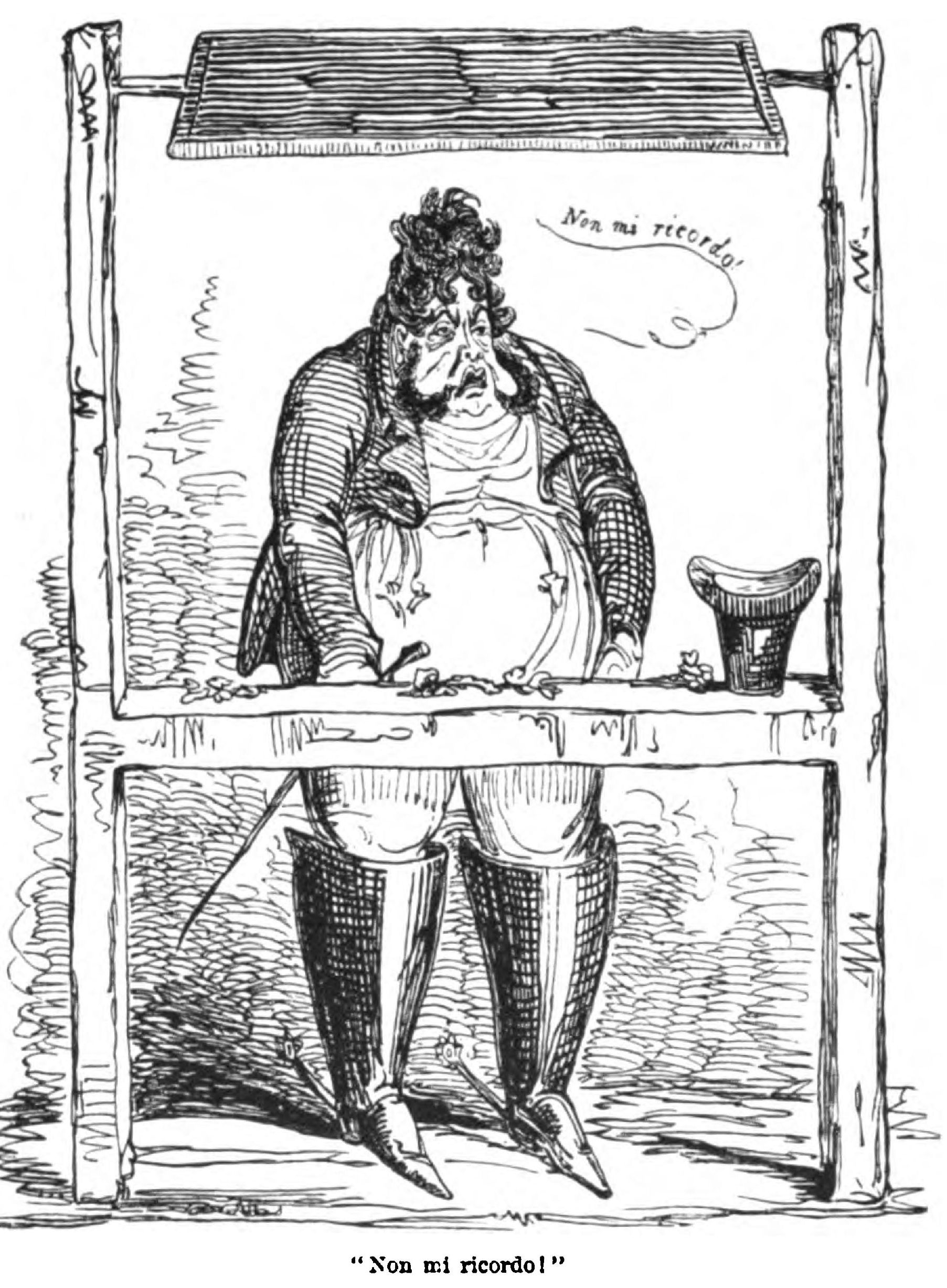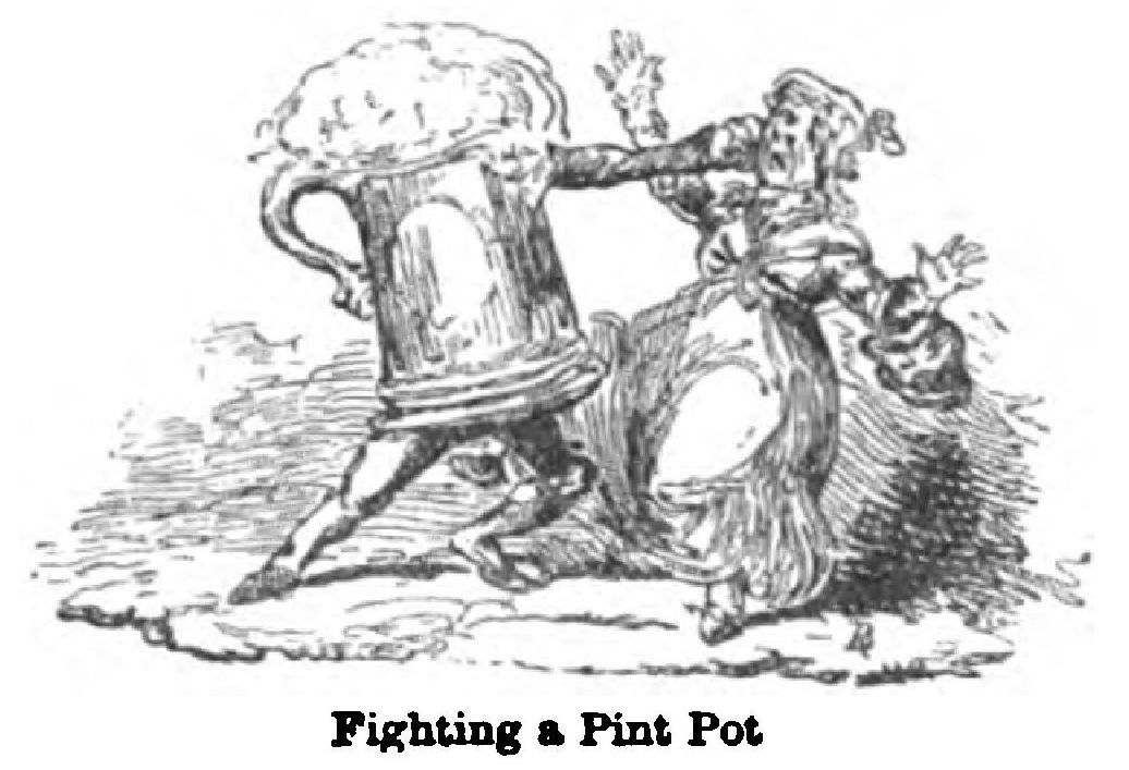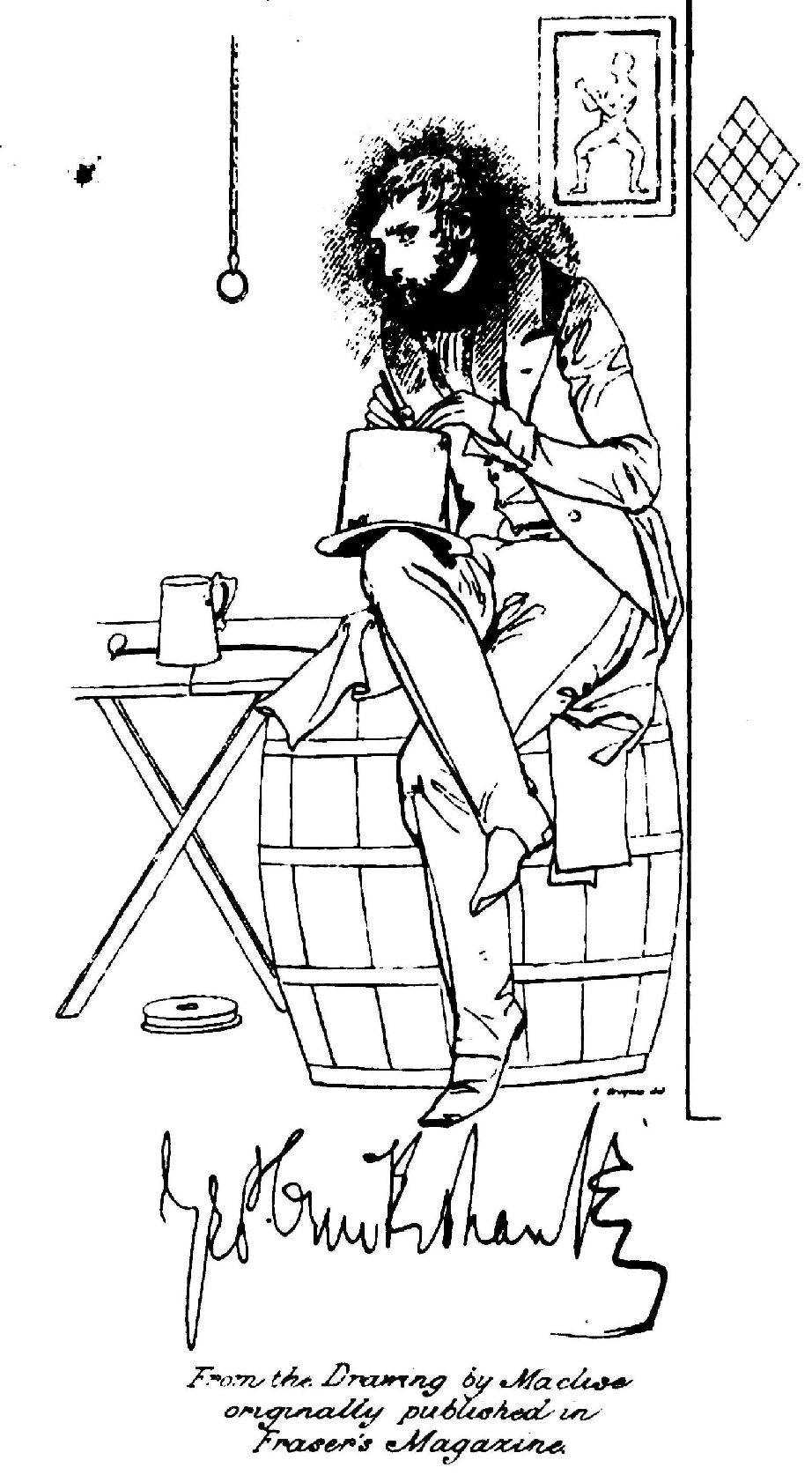 In those days, and down to those days, Cruikshank was convivial—sometimes to excess. It was not for nothing that Maclise had drawn him seated upon a beer barrel.*