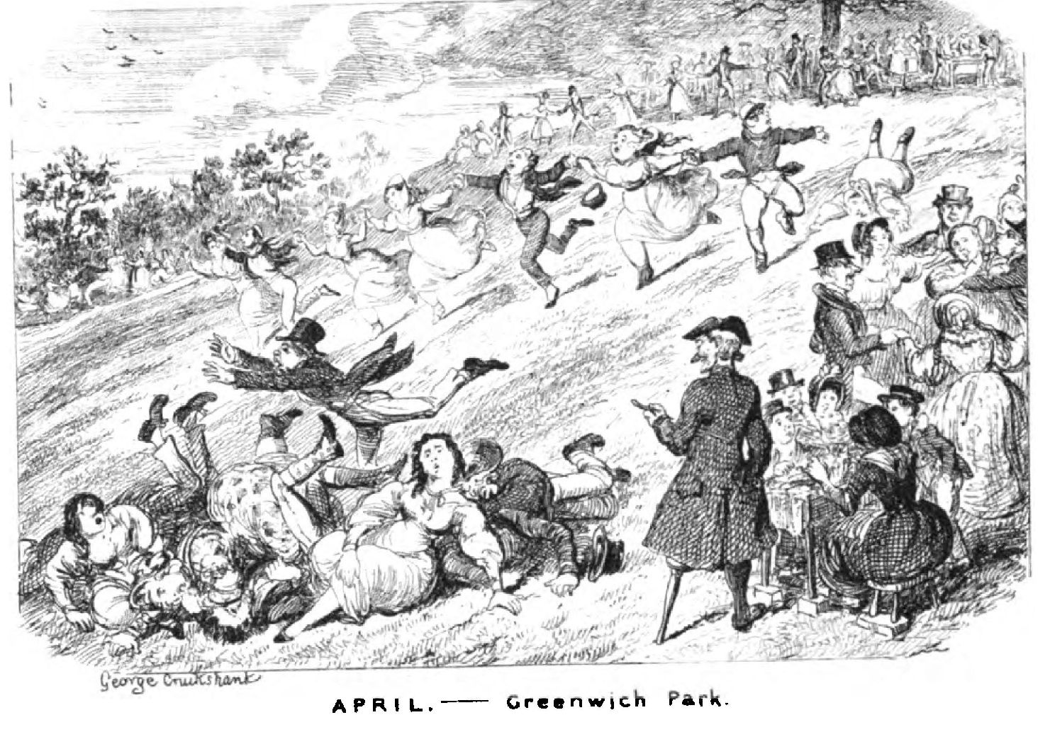 The versatility and the perennial vigour and vivacity of Cruikshank’s genius is nowhere more strikingly displayed than in the variety with which he has treated of the seasons in the Comic Almanac. One year March is illustrated by a meeting of workmen going to work, and roysterers returning home, day and night being nearly equal. Next March the cook is tossing pancakes. April is now shown upon the famous hill in Greenwich Park, and now in a wet return from the races. One November we have Lord Mayor’s Day, with one of Cruikshank’s dense crowds, and the next year we are treated to a delicious bit of humour.