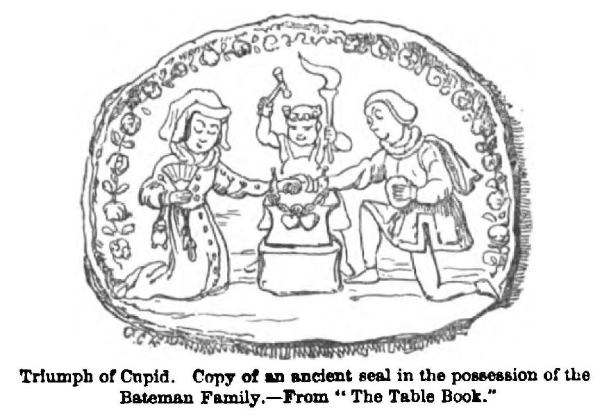 Cupid perches himself upon his foot, and toasts a heart at the fire; jumps upon the back of Old Time who bears the clock upon the mantelpiece; is enthroned in a triumphal car, with kings and princes, bishops and generals, lawyers and stock-jobbers, drummer-boys and jack-tars and sweeps, clown and harlequin, and even slippered pantaloon, and Chelsea pensioners upon wooden stumps, for his court. The car is drawn by subdued lions and leopards.