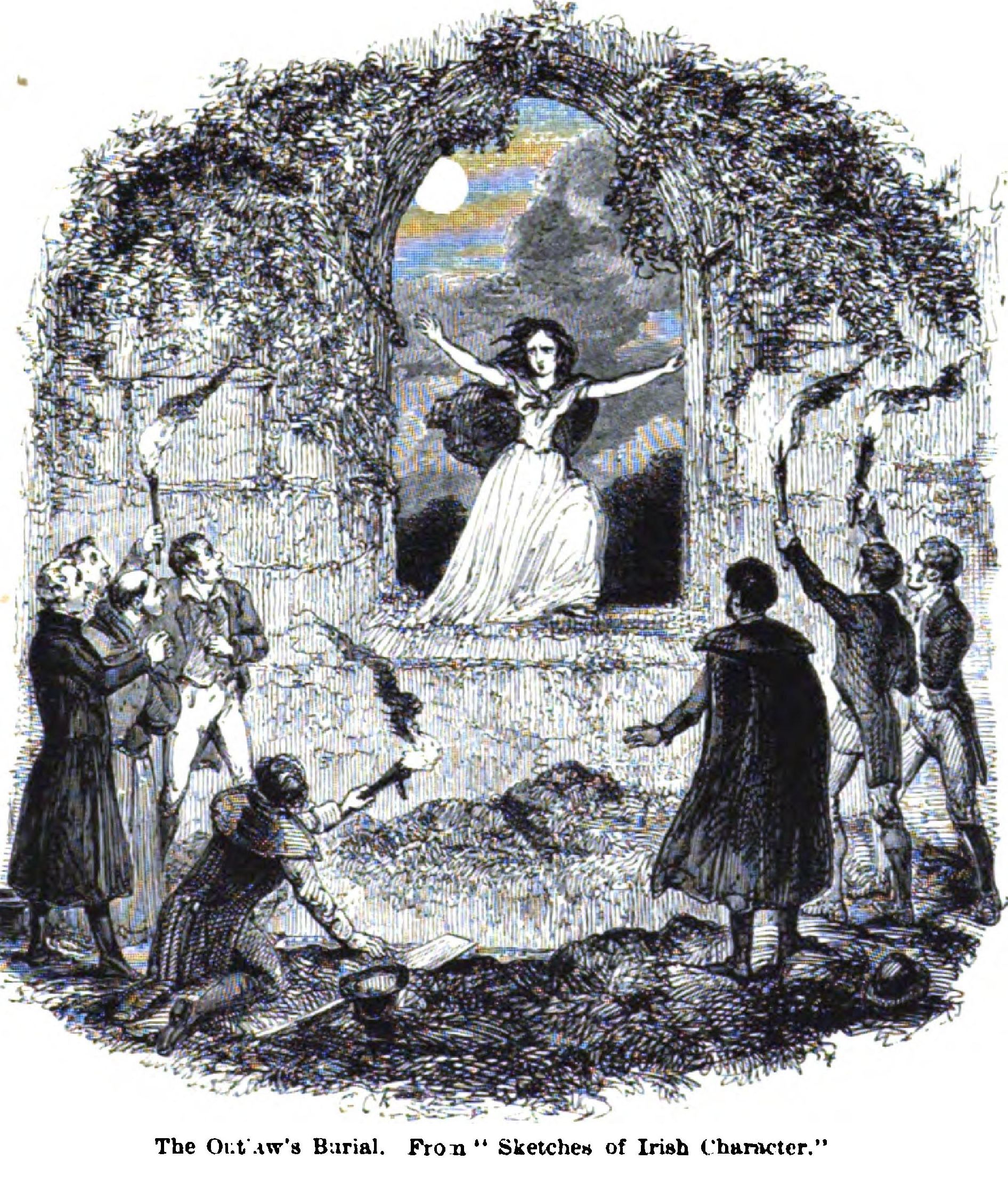 He died at his house in the Hampstead Road, on the 1st of February. He was buried temporarily—the Crypt of St. Paul’s being under repair—at Kensal Green. The only member of the Royal Academy who attended his funeral was Charles Landseer, R.A., who was almost as old as Cruikshank. But Messrs. Tenniel and Du Maurier were there, with poor W. Brunton, a clever caricaturist, who was to fall in his youth. Cruikshank’s friend, George Augustus Sala, and Lord Houghton, were among his pall-bearers; and in the group about the coffin were Edmund Yates, S. G. Ball, General M’Murdo, and John Sheehan, the “Irish Whisky-drinker.”