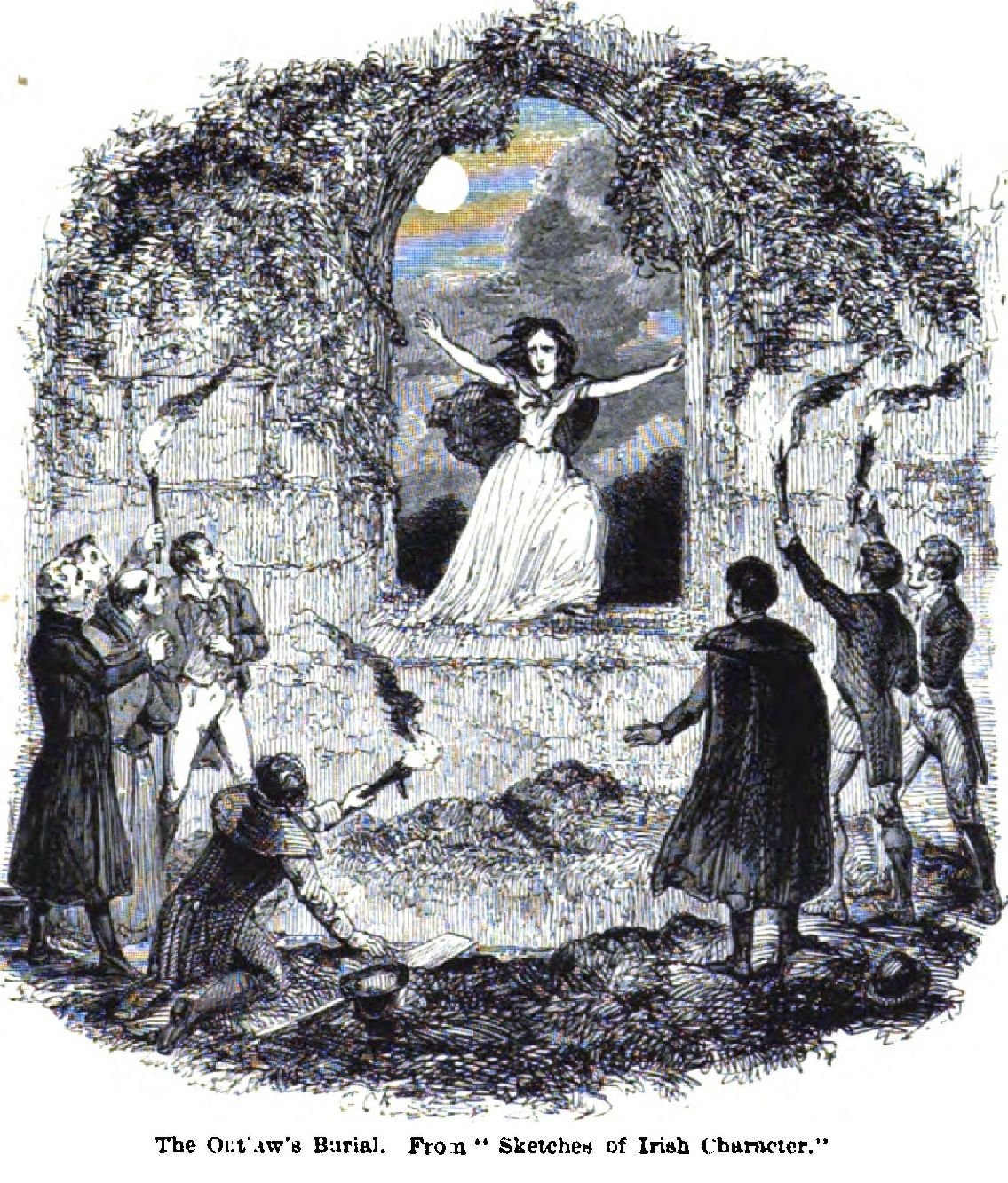 Within the busy decade, 1837—1847, Cruikshank executed many separate etchings for Bentley’s Miscellany and Ainsworth’s Magazine. His work is to be found scattered far and wide. One month he appears as the illustrator of a humorous song or scena by J. Blewitt—“The Matrimonial Ladder” (the ladder was a favourite form with him for conveying the various aspects of a subject)—or Keeley in the new comic song of “Wery Ridiculous”; the next he is the whimsical illustrator of Beaufoy’s Advertisement of his Cure for the Toothache—wood drawings engraved by Orrin Smith. Nor had he quite put aside his habit of expressing himself pictorially on political events. In 1843 he published, from Mr. David Bogue’s shop in Fleet Street, a separate design entitled “The Queen and the Union. No Repeal! No O’Connell!” It was a woodcut enclosing text in type, the text being Cruikshank’s own declamation against the Irish Agitator. Britannia and Erin are represented in the drawing seated, with joined hands, on the shores of the Channel; while the “blustering, foul-mouthed bully, with one foot on Britannia’s shoulder, and the other on Erin’s harp, has raised an axe to sunder the friends.” Frontispieces and covers he designed by the score,—now to “A Tale of a Comical Stick,” and now to The Yorkshireman, a religious and literary journal; and now again a headpiece to one of Mrs. S. C. Hall’s “Sketches of Irish Character,” or a frontispiece to a book on “Prisons and Prisoners.” To every item of this extraordinary quantity and variety of pictorial labour Cruikshank gave his utmost energy. He was a most faithful worker, who never stinted himself, even when the humblest or least important subject was in hand. Let me note, however, some exceptions.
