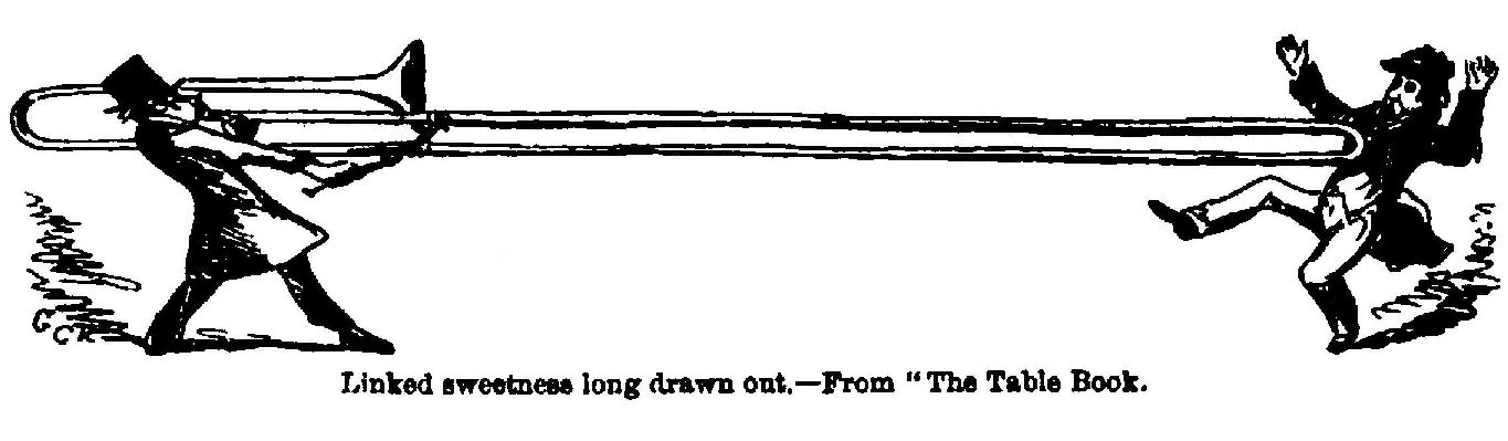 “I will not go into the details of how I assisted this author (Ainsworth) with head and hand work in these novels, but I did my best to design and suggest; and my time was so much occupied in performing this duty, and also with some other matters, that I was not able to bring out my Omnibus as an annual, as I had intended to have done; but I now determined to bring it out again in monthly numbers; and as Bradbury and Evans (the fathers of the present firm) had printed that work for me, I went to their office to see what stock there was of the Omnibus on hand, and to make arrangements for the republishing of it; and when I mentioned this to my friend Bradbury, he said, ‘Ah, it is a pity that work was ever stopped; we should have been glad to have bought it of you, and will buy it now, if you would like to sell it.’ I replied that I did not wish to dispose of it, but if they would like to join me, I should be glad to have them as partners. ‘Agreed,’ said both Mr. Bradbury and Mr. Evans; and as these friends of mine were men of business, as well as gentlemen and men of honour, in this case there was a written agreement clearly and legally drawn out, and duly signed by both parties. But their engagements at that time were so many, that a considerable time elapsed before arrangements could be made for the republishing of the Omnibus; so they then suggested, as it was such a long time since my Omnibus had been on the road, that it would, perhaps, be better to start another vehicle of the same build, but under another name. To this I agreed; and thus originated ‘The Table Book,’ which was edited by my friends the late Gilbert à Becket and Mark Lemon.”
