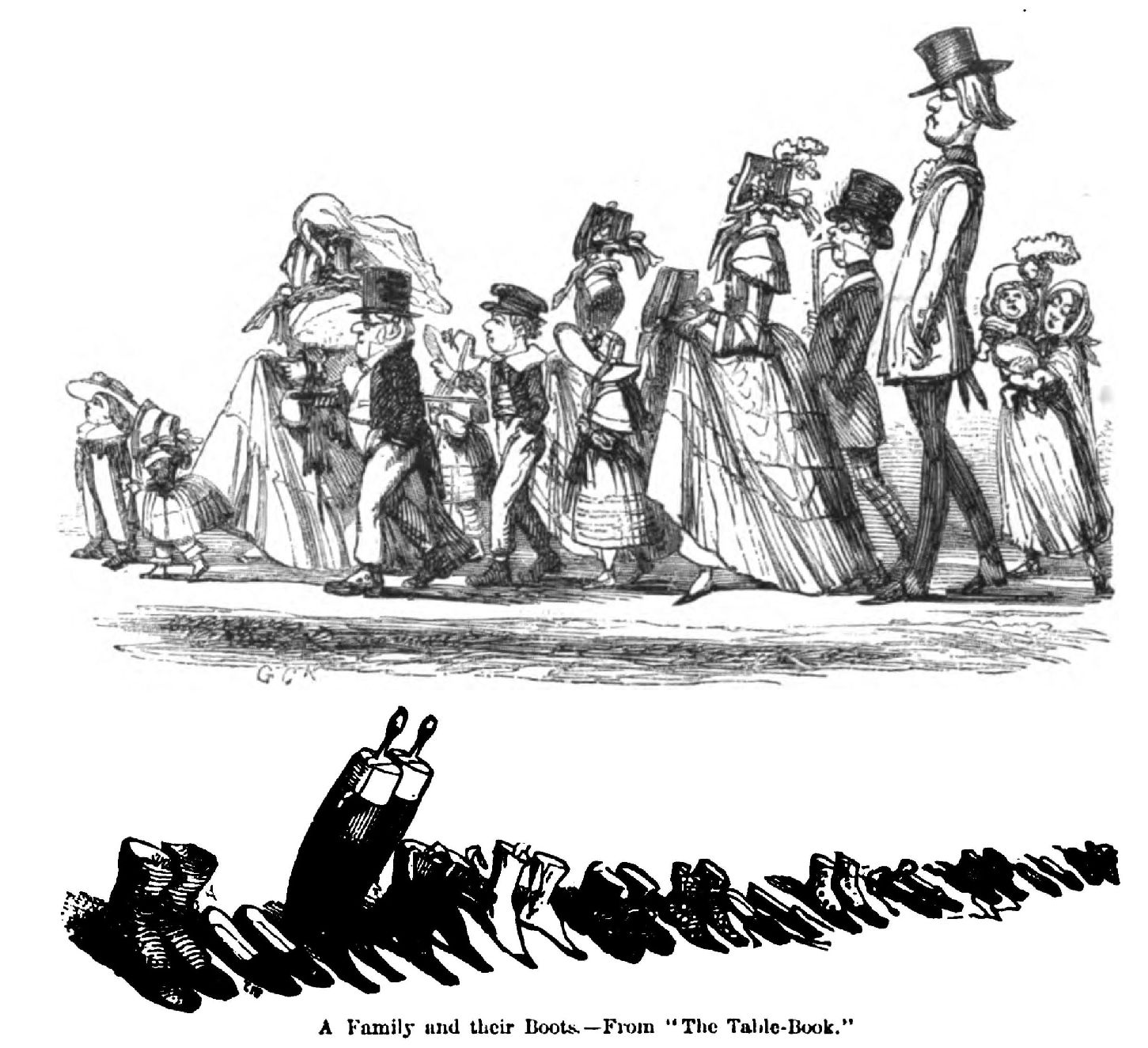 To return to the “Table Book.” The miscellaneous etchings and drawings in this book are mostly arrows aimed at folly as it was flying at that time. The railway mania, clairvoyance, emigration, the fashions, furnished Cruikshank with inexhaustible humorous or grave material. His etching of Mr. John Ball in a Quandary, or the Anticipated Effects of the Railway Calls, is one of those wondrously filled drawings, in the composition of which he stands alone. John Bull is in his armchair, with a great railway bell clanging over his head. Hosts of pestilent demons cover him, and are stripping him. Some are hoisting his hat, some are bearing away his wig, others have perched ladders against his capacious paunch, and are dragging his money and his watch from his waistcoat pockets. The greedy imps are tugging his gloves from his hands, unfastening his neckcloth, and pulling his boots off. Liliputian lawyers, at hand, are demolishing a barrel of oysters, and leaving a plentiful supply of shells for their clients. Imps, driving a little locomotive, have attached it to Bull’s cash-box, and are making off with it; and in the distance the pictures are marked for sale. Then we have a few bits of Cruikshankian humour called “‘Heads of the Table,”—the final head being a capital study of an old gentleman who is entre deux vins, saying, “Well, we’ll just take another glass—and then—we’ll join the—the ladies.” Opposite this page is a drawing of a family, and also of their shoes.