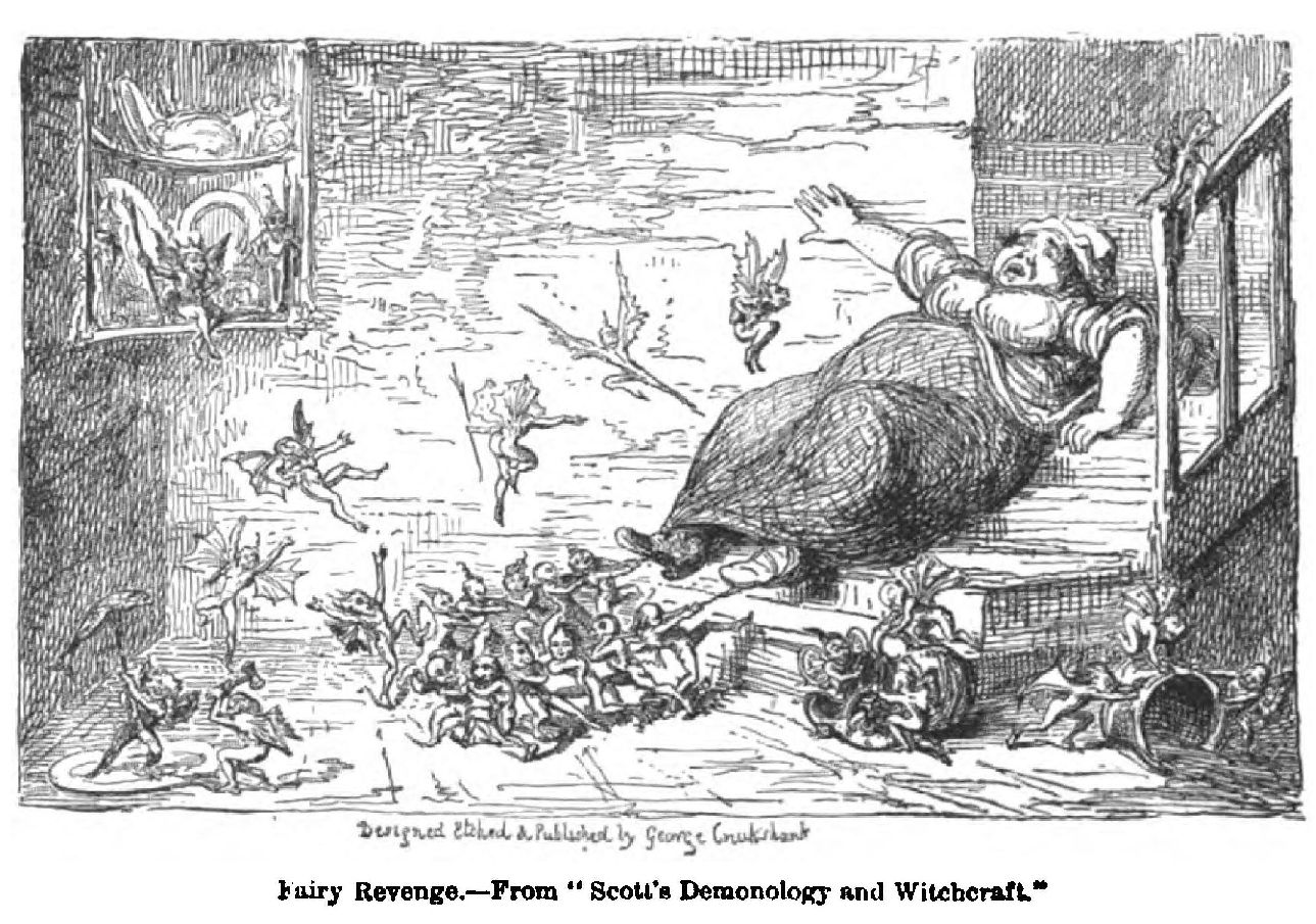 Cruikshank then quotes passages from Dickens’s article, and continues: “Now this, which you call ‘Frauds on the Fairies,’ in my humble opinion, might as well have been called ‘Much Ado about Nothing’; for, had my editor been altering the title of any standard literary work, the writing of any man of mark—one of your own glorious books, for example—then, indeed, you might have raised a hue and cry; but to insist upon preserving the entire integrity of a fairy tale, which had been and is constantly altering in the recitals, and in the printing of various editions of various countries, and even counties, appears to my little mind like shearing one of your own ‘whole hogs,’ where there is ‘great cry and little wool.’”
