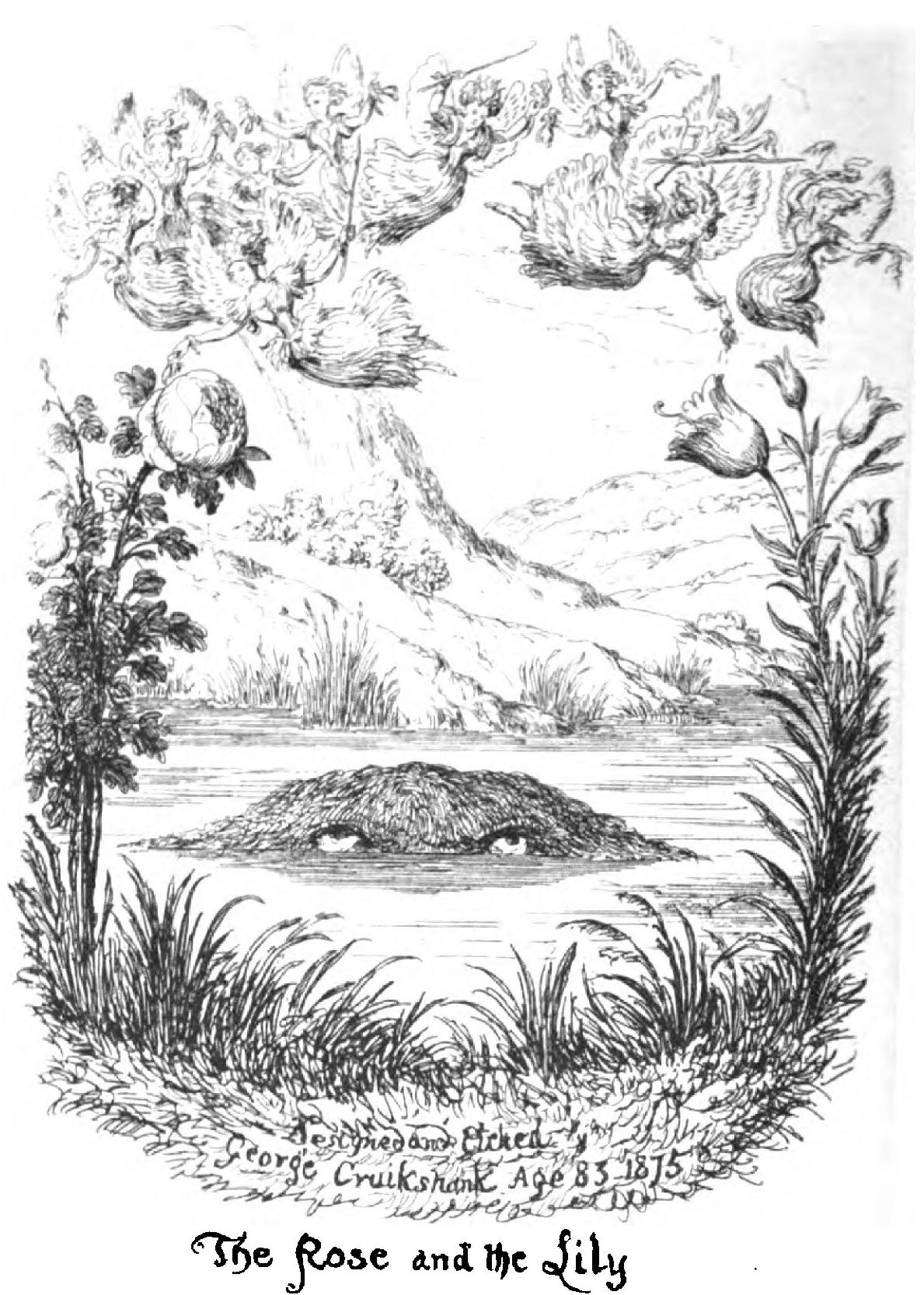 The twenty years which elapsed between the first issue of “Falstaff” and the artist’s death, albeit no idle years, have left not much completely worthy of the best that had gone before. Cruikshank furnished etchings to the “Life and Enterprises of Robert William Elliston, Comedian” (1857), “Midnight Scenes and Social Photographs—revelations of the Wynds and Dens of Glasgow” (1858), Mr. Alfred Cole’s “Lorimer Littlegood” (1858), “Stenelaus and Amylda, a Christmas Temperance Tale” (1858), a frontispiece to Lowell’s “Biglow Papers” (1859), Dudley Costello’s “Holiday with Hobgoblins” (1861), “The Bee and the Wasp; a Fable in Verse” (1861), “A Discovery concerning Ghosts” (1863), Robert Hunt’s “Popular Romances of the West of England” (1865), the “Savage Club Papers” (1867), “The Oak,” a magazine, edited by his friend the Rev. Charles Rogers (1868), “Coila’s Whispers,” by the Knight of Morar (1869), “The Brownies,” and other tales, by Juliana Horatia Ewing (1870), “The True Legend of St. Dunstan and the Devil,” by Edward G. Flight (1871), “Lob-lie-by-the-Fire,” and other tales, by Juliana Horatia Ewing (1874). Then there are two works, the illustrations to which proclaim the coming end. “Peeps at Life,” and “Studies in my Cell,” by the London Hermit, published in 1875, are signed “George Cruikshank, aged 83, 1875;” and in Mrs. Octavian Blewitt’s “The Rose and the Lily,” is a frontispiece—George Cruikshank’s last design—signed, “Designed and etched by George Cruikshank, age 88, 1875.” This plate is here reproduced.