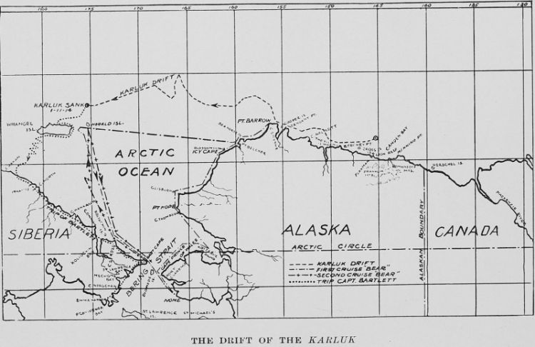 It was an elaborate expedition, one of the largest and most completely equipped, I believe, that have[4] ever gone into the Arctic. It differed, too, in one other respect than that of size, from previous Arctic expeditions, in that its main objects were essentially practical,—in fact, one might say, commercial. It was in two divisions. The northern party, under Stefansson himself, was primarily to investigate the theory so ably advanced by Dr. R. A. Harris of the United States Coast and Geodetic Survey that new land—perhaps a new continent—was to be found north of Beaufort Sea, which is that part of the Arctic Ocean immediately to the north of Alaska. “The main work of the party aboard the Karluk”—to quote Stefansson—“was to be the exploration of the region lying west of the Parry Islands and especially that portion lying west and northwest from Prince Patrick Island. The Karluk was to sail north approximately along the 141st meridian until her progress was interfered with either by ice or by the discovery of land. If land were discovered a base was to be established upon it, but if the obstruction turned out to be ice an effort was to be made to follow the edge eastward with the view of making a base for the first year’s work near the southwest corner of Prince Patrick Island, or, failing that, on the west coast of Banks Island.” The Karluk was to go first to Herschel Island, the old rendezvous of the Arctic whaling fleet and the northernmost station of the [5]Canadian Mounted Police. If she should be beset in the ice and forced to drift, it was expected that certain theories about the direction of Arctic currents would be tested, and there would also be opportunity for dredging and sounding.
