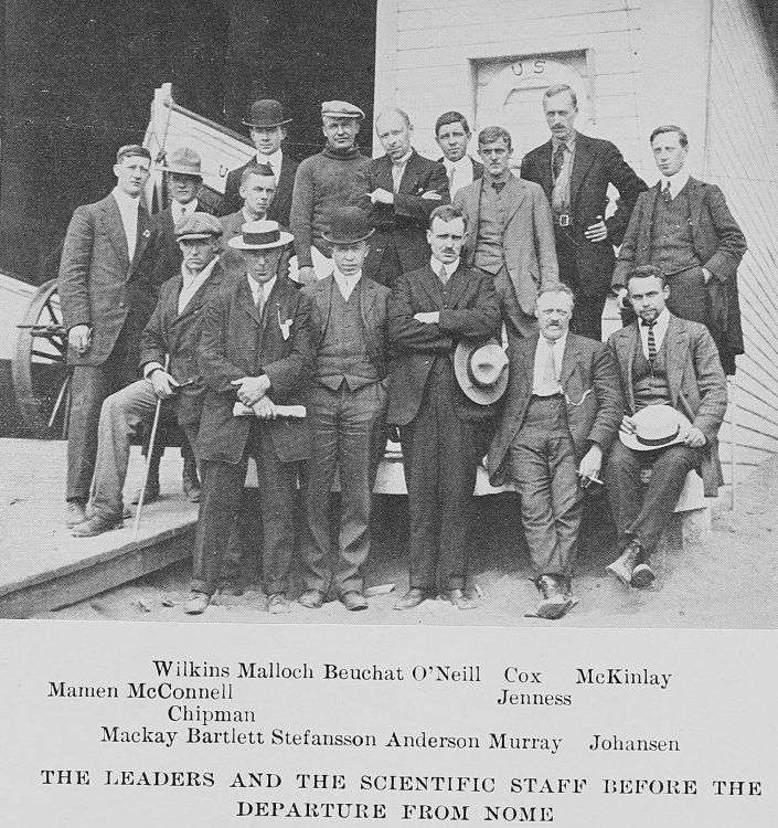 The scientific staff gathered for the expedition was large and well-equipped. Besides Stefansson, anthropologist, and Dr. Anderson, zoologist, it included twelve men who were all specialists. The Canadian Geological Survey detailed four men to our party: George Malloch, an expert on coal deposits and stratiography, who had been a graduate student at Yale; J. J. O’Neill, a mining geologist, whose specialty was copper; and Kenneth Chipman and J. R. Cox, skillful topographers. For studying ocean currents and tides and the treasures that might be brought up from the bottom of the sea we had James Murray of Glasgow, oceanographer, who had worked for many years with the late Sir John Murray, one of the world’s greatest authorities on the ocean. Murray had been with Sir Ernest Shackleton on his Antartic expedition and afterwards had been biologist of the boundary survey of Colombia, South America. To study the fish of the Arctic Ocean we had Fritz Johansen, who had been marine zoologist with Mylius Erichsen in East Greenland and had done scientific work for the Department of Agriculture at Washington. As forester we had Bjärne Mamen, from Christiania, Norway, who had been on a trip to Spitsbergen[8] and had done work in the timber-lands of British Columbia. As the study of the Eskimo was one of the most interesting objects of the expeditions we quite naturally had two anthropologists besides Stefansson, one, Dr. Henri Beuchat of Paris, the other, Dr. D. Jenness, an Oxford Rhodes Scholar, from New Zealand. The magnetician was William Laird McKinlay, a graduate of the University of Glasgow, who had been studying in the Canadian Meteorological Observatory in Toronto. The photographer was George H. Wilkins, a New Zealander, who had been a photographer in the Balkan War and possessed mechanical ability. He had a motion-picture apparatus as well as other cameras. In medical charge of the expedition was Dr. Alister Forbes Mackay, who had served in the British navy after his graduation from the University of Edinburgh, and, like Murray, had accompanied Shackleton into the Antarctic. Five of these twelve men, as shall be related, were to lay down their lives in the cause of science during the coming year.
