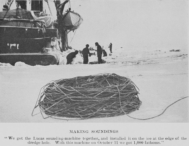 With the Rodgers Harbor party safe aboard, the King and Winge steamed to Waring Point. On account of the ice they were unable to get nearer than two miles from shore. Swenson and his party, again accompanied by McConnell, went towards the shore over the ice; Kerdrillo came out to meet them. Escorted by him they covered the rest of the distance to the shore, several of the others rushing out over the ice to meet them. It was found that if it had not been for the snow-storm[322] which was already growing severe the whole party would have migrated that very day to a point on the north side of the island where, if they had to stay through another winter, as seemed not unlikely, they would have a fresh supply of drift-wood to draw on. Their camp at Waring Point was in bad shape. Their tents were wearing out, their food supply was scanty and they had only forty rounds of ammunition left with which to provide themselves with food during the coming winter. To save their cartridges they had lived as far as possible on birds’ eggs, fish which they caught through the ice and gulls which they obtained by angling for them on the cliffs with hook and line, a form of bird-hunting without a shot-gun. The rescue, both here and at Rodgers Harbor, was effected just in time.