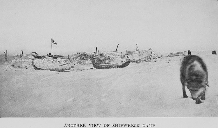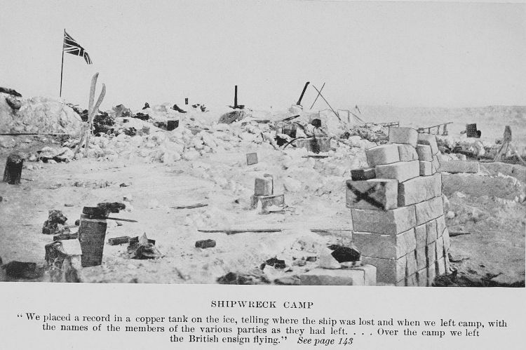 The rescuers helped the rescued to gather together the few possessions of value or interest at the camp and then, leaving a notice for any other ship that might come to see about the men, all hands were soon on board the King and Winge, enjoying the luxury of a bath, clean clothes and an ample breakfast. The tent was left standing as it was, but the British flag that had flown so long at half-mast was taken with the rescued men.