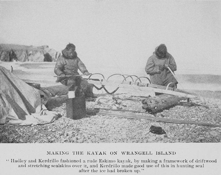 “Hadley and Kerdrillo fashioned a rude Eskimo kayak, by making a framework of driftwood and stretching sealskins over it, and Kerdrillo made good use of this in hunting seal after the ice had broken up.”