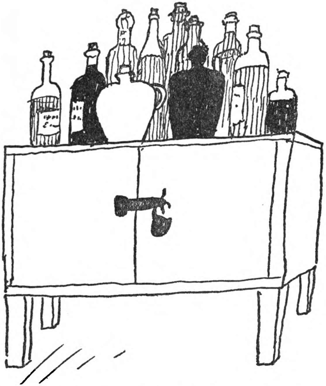 Finally, don’t paint your front hall water-cooler with floral scenes. Go to some good marine painter and instruct him to make a decoration in keeping with the purpose of the cooler. There is water inside the vessel, is there not? Then let him paint water outside. Better still, coat your cooler with mucilage and lightly spray powdered mica upon it. But don’t,[147] whatever you do, attempt to ornament your cooler with festoons of gilt tassels. Your cooler is not the place for tassels. I know it is done, but my last and only word on the subject is, Don’t. Tassels of any kind are absolutely out of key on your cooler. They should be kept for your umbrella, where they will give that personal touch that is distinctive.