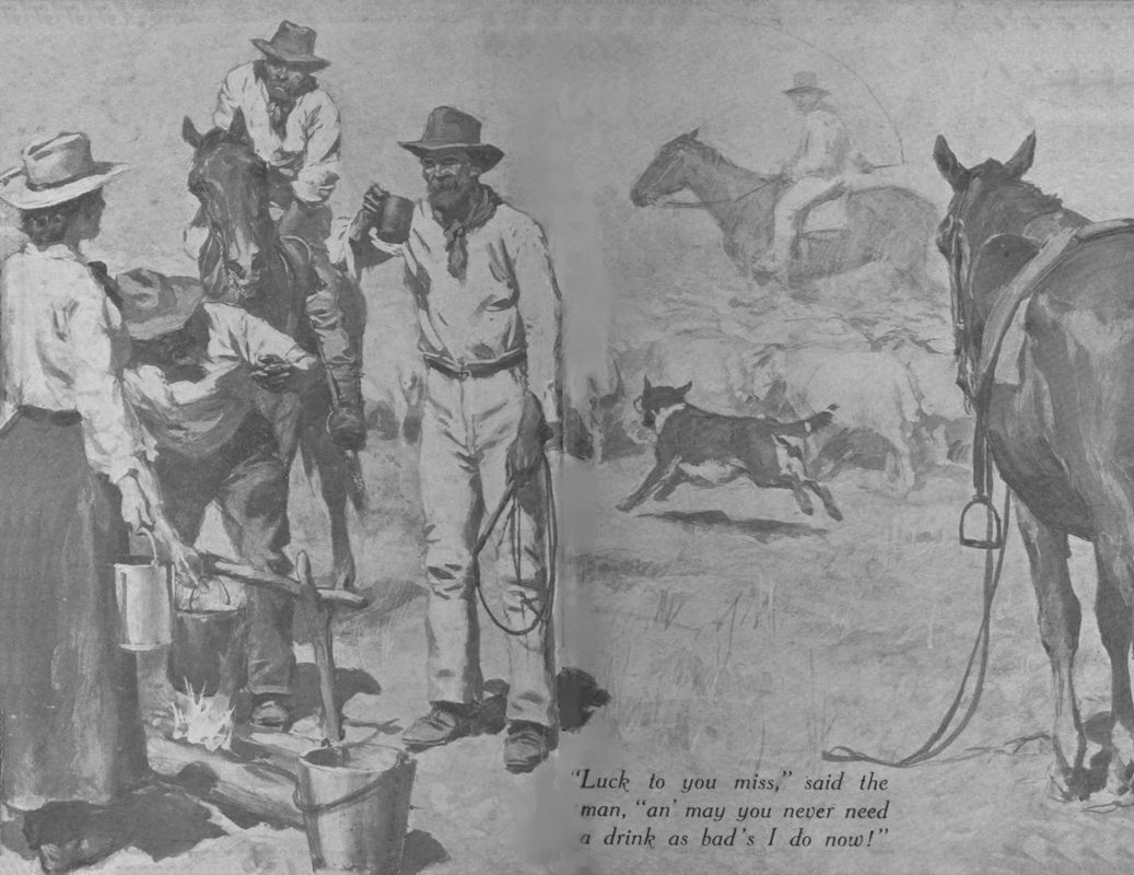 “Luck to you miss,” said the man, “an’ may you never need a drink as bad’s I do now!”