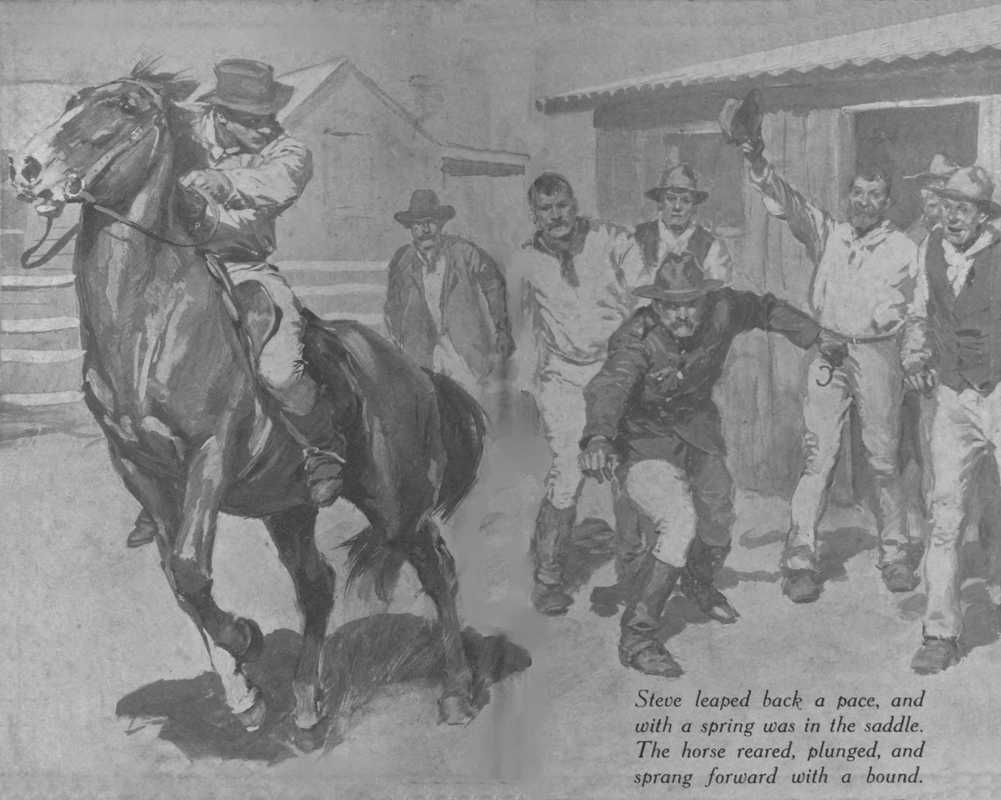 Steve leaped back a pace, and with a spring was in the saddle. The horse reared, plunged, and sprang forward with a bound.