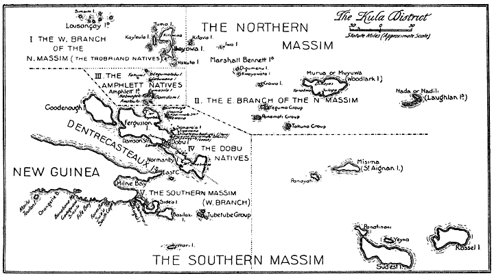 In the present state of Ethnography, when so much has still to be done in paving the way for forthcoming research and in fixing its scope, each new contribution ought to justify its appearance in several Points. It ought to show some advance in method; it ought to push research beyond its previous limits in depth, in width, or in both; finally, it ought to endeavour to present its results in a manner exact, but not dry. The specialist interested in method, in reading this work, will find set out in the Introduction, Divisions II–IX and in Chapter XVIII, the exposition of my points of view and efforts in this direction. The reader who is concerned with results, rather than with the way of obtaining them, will find in Chapters IV to XXI a consecutive narrative of the Kula expeditions, and the various associated customs and beliefs. The student who is interested, not only in the narrative, but in the ethnographic background for it, and a clear definition of the institution, will find the first in Chapters I and II, and the latter in Chapter III.