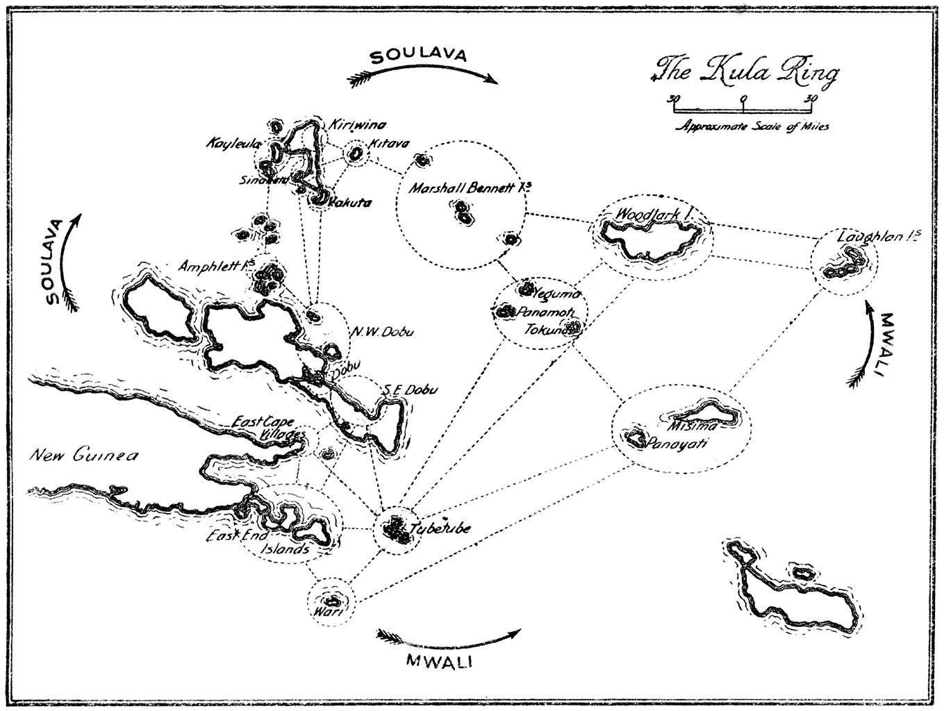 Following the various threads further on, I have no doubt that the islands lying near the East end of New Guinea—Roge’a, Sariba, Basilaki—are and were in olden days in the Kula ring, communicating in the East with Tubetube and Wari, while to the North they were in contact with the natives of Normanby Island. Whether the large village complex lying at East Cape was also in the Kula I cannot definitely say. In any case all the strands led to the Eastern shores of Dawson Straits, by way of the North-Eastern shores of Normanby Island. From here, from the district of Dobu, we have traced the further lines with complete exactness and detail.
