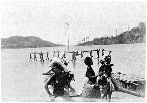 The sailing is characterised by the priority enjoyed by the Kulutula clan, who, as we have seen in a previous chapter (Chapter IX, Division III) sail ahead and have the privilege of landing first on any beach, on which they stop. On arrival, they perform the beauty magic, and sailing towards the beach, the magic of “shaking the mountain” is also recited. In the Koya, the transactions resemble to a certain extent those of the Kula. As my informant said: