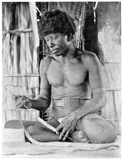 An even more interesting custom obtains in Kayleula. A pair of shells would be fished and broken in one of the villages of that island, or in one of its small sister islands, Kuyawa and Manuwata. In this unfinished state, as a band of coarse shell, called as such makavayna, it is then brought to the Amphletts, and there given as a Kula gift. The Gumasila man, who receives the shells, will then polish them up, and in that state again kula them to Dobu. The Dobuan who receives them then bores holes in the side, where one rim overlaps the other (clearly to be seen on Plate XVI) and attaches there the ornaments of black, wild banana seeds, and spondylus discs. Thus, only after it has travelled some one hundred miles and passed through two stages of the Kula, has the mwali received its proper shape and final outfit.