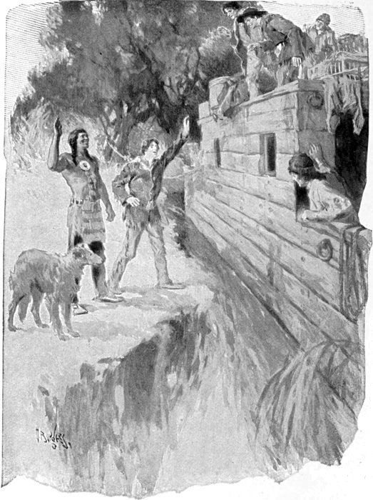 A moment later it emerged into the cleared space about the jetty, and there stood Moses on top of the cabin roof. He had discovered them upon the bluff, and was swinging his cap, shouting: