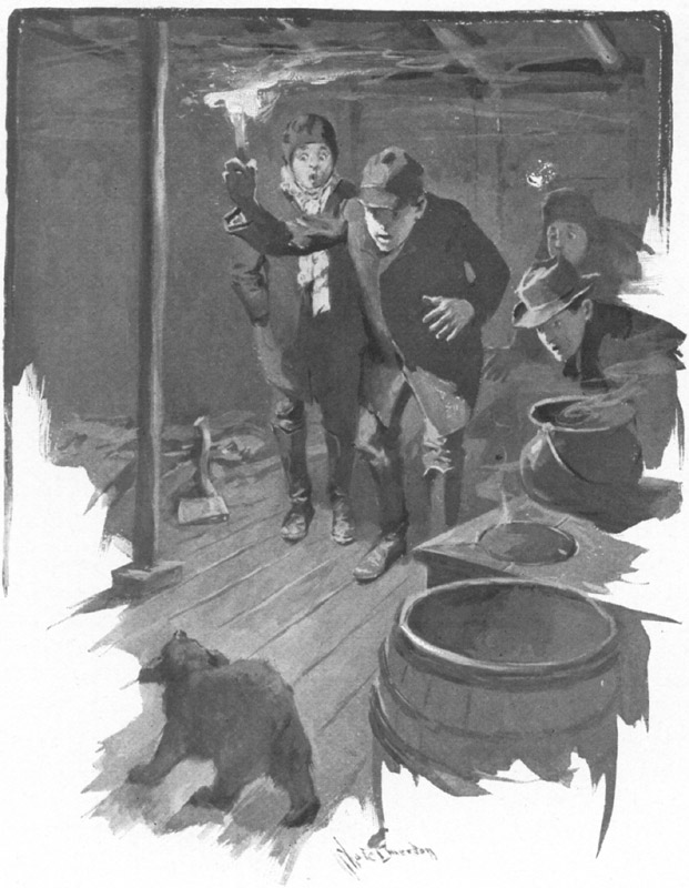 When, however, he opened the door a little, there crept in, whimpering, not Tyro, but a small, dark-colored animal, which the faint light given out from the stove scarcely enabled us to identify. The creature ran behind the barrels; and Tom clapped the door to. Addison lighted a splinter and we tried to see what it was; but it had run under the long bunk where the loggers once slept. After a flurry, we drove it out in sight again, when Tom shouted that it was a little "beezling" of a bear!