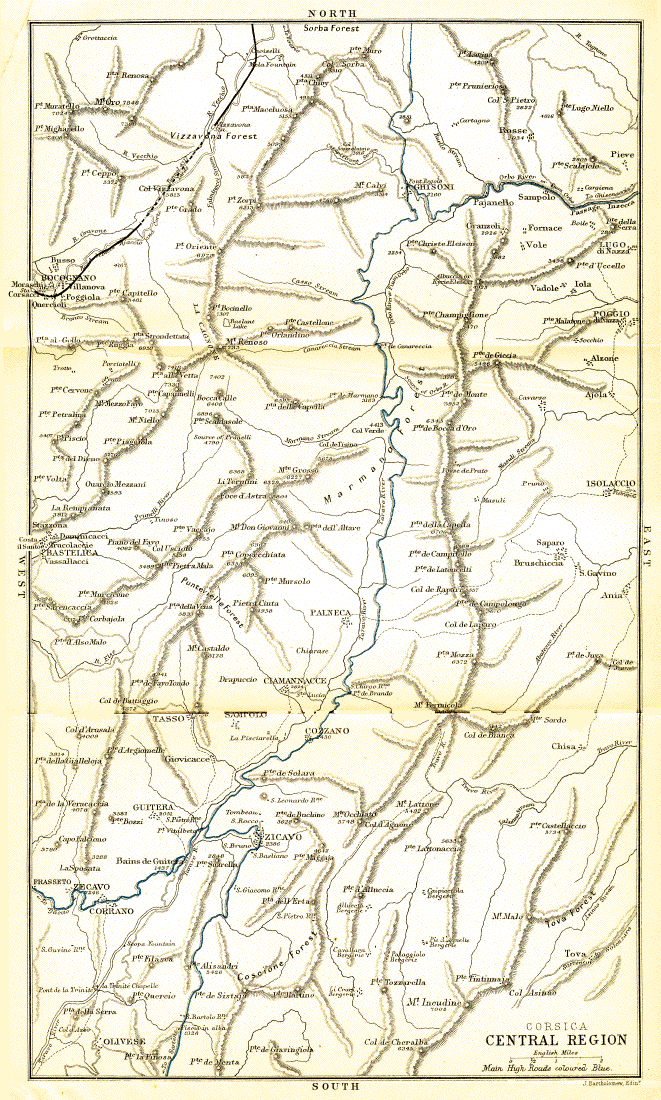 Ajaccio and Apa to Zicavo and the Baths of Guitera, by Santa-Maria-Siché, Frasseto and Zecavo. S. Maria-Siché is the birthplace of the fair and gentle Vanina. From Zicavo the ascent is made of Mt. Incudine; whence is beheld the finest view in Corsica. See maps on fly-leaf and fronting p. 27 |