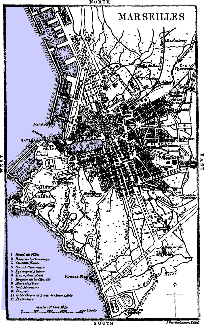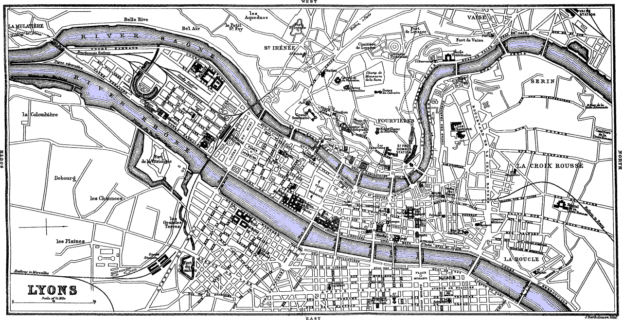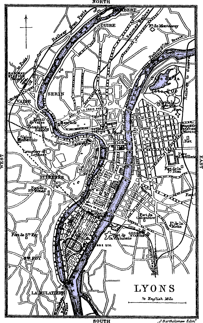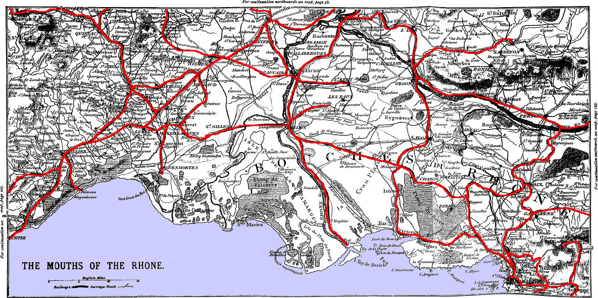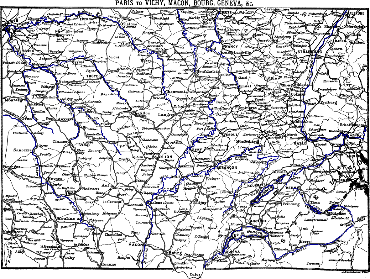 In the carriage cast the eye over the line as given in our railway map, and note the junctions; for at many of these—such as Amiens, Rouen, Culoz, Macon, etc. etc.—the passengers are frequently discharged from the carriages and sent into the waiting-rooms to await other trains. On such occasions great attention must be paid to the names the porter calls out when he opens the door of the waiting-room, otherwise the wrong train may be taken. To avoid this, observe on our railway map what are the principal towns along the line in the direction required to go; so that when, for example, he calls out, “Voyageurs du Côté de Lyon!” and we be going to Marseilles from Macon, we may, with confidence, enter the train, because, by reference to the map, we see we must pass Lyon to reach Marseilles. The little railway map will be found very useful, and ought always to be kept in readiness for reference.