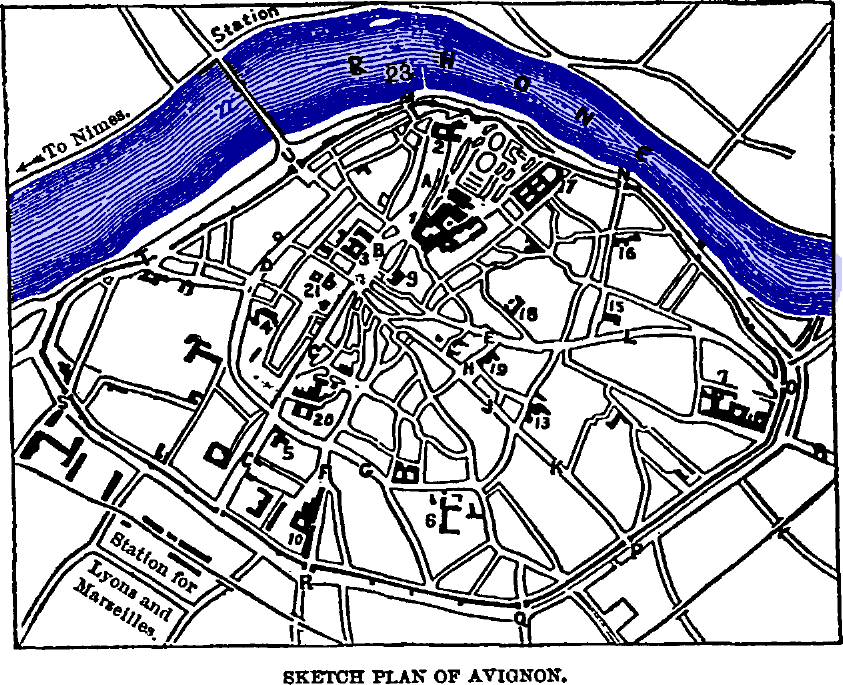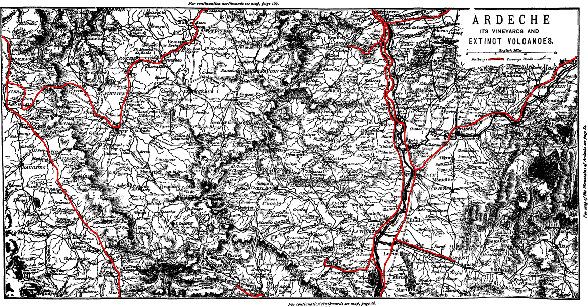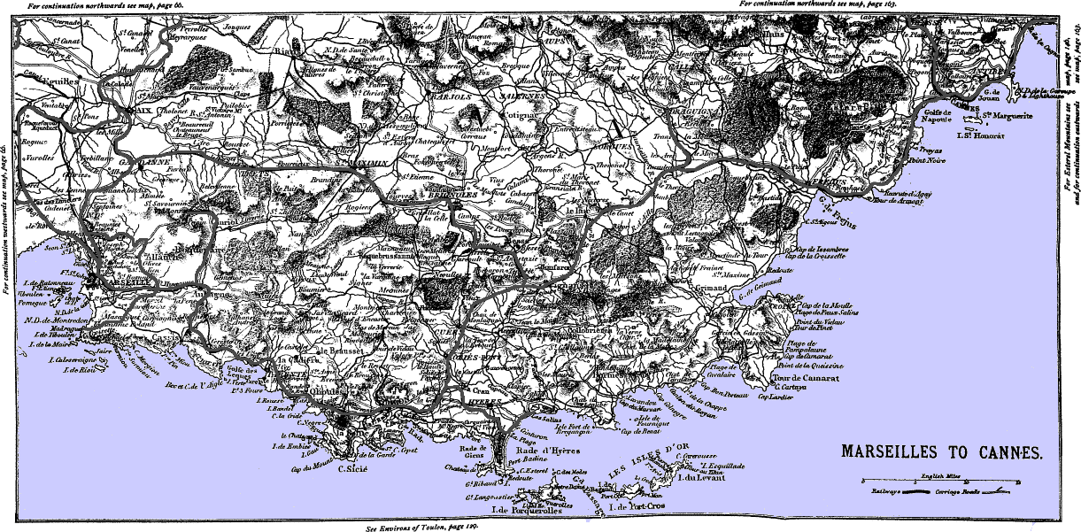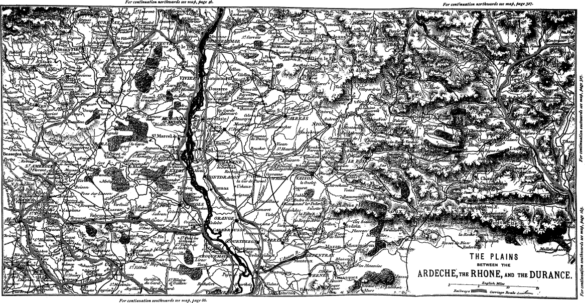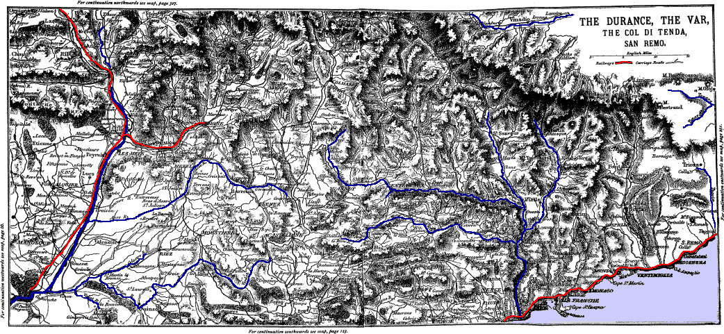 viiiFrom the western end of the Riviera the best way north and to the baths is by the valley of the Rhône (map, p. 27), in which there are many places of great interest, such as Arles (p. 68), Avignon (p. 58), Orange (p. 51), and Lyons (p. 29). From Lyons take the western branch by Montbrison (p. 349) for Vichy, Mont-Dore, and Bourboule. For Aix-les-Bains take the eastern by Ambérieux (p. 281) and Culoz (p. 282). From Avignon, Carpentras (p. 54), Pont-St. Esprit (p. 98), Montélimart (p. 48), La Voulte (p. 82), Crest (p. 46) and Grenoble (p. 324), interesting and picturesque excursions are made. From Carpentras Mont Ventoux (p. 56) is visited. From La Voulte, Ardechè (p. 45) is entered. From Crest diligences run to the towns and villages between it and Aspres (pp. 47 and 345). From Grenoble the roads and railways diverge which lead to the lofty peaks of the western Alps and to the mountain passes between France and Italy.