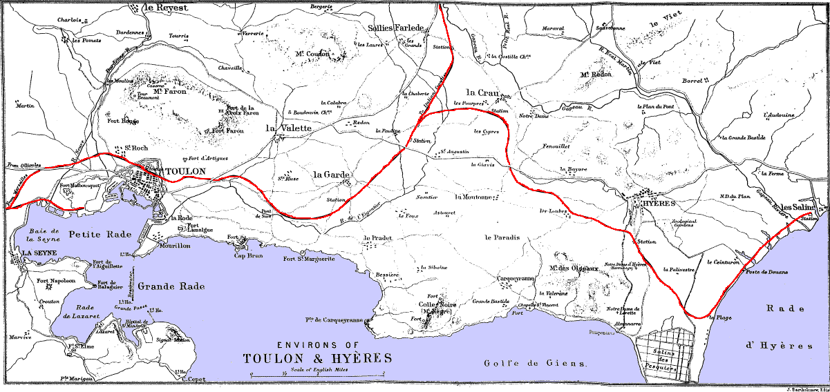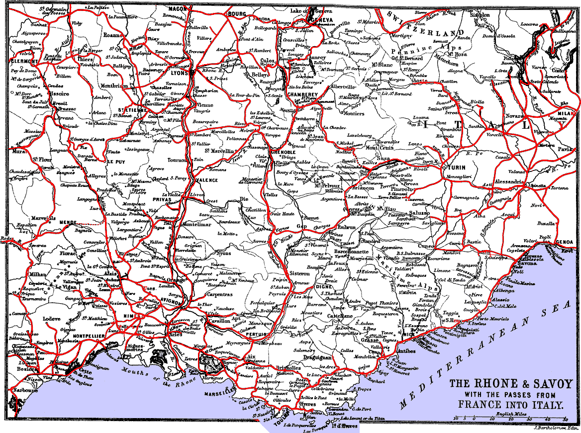 For the whole of the south-east of France use the time-tables of the “Chemins de Fer de Paris à Lyon et à la Méditerranée.” Sold at all their stations, price 8 sous. In Italy use the “Indicatore Ufficiale,” 1 fr. or 1 lira, which gives, besides the time-tables of the railway trains, those also of the steam-trams, which traverse the country in all directions.