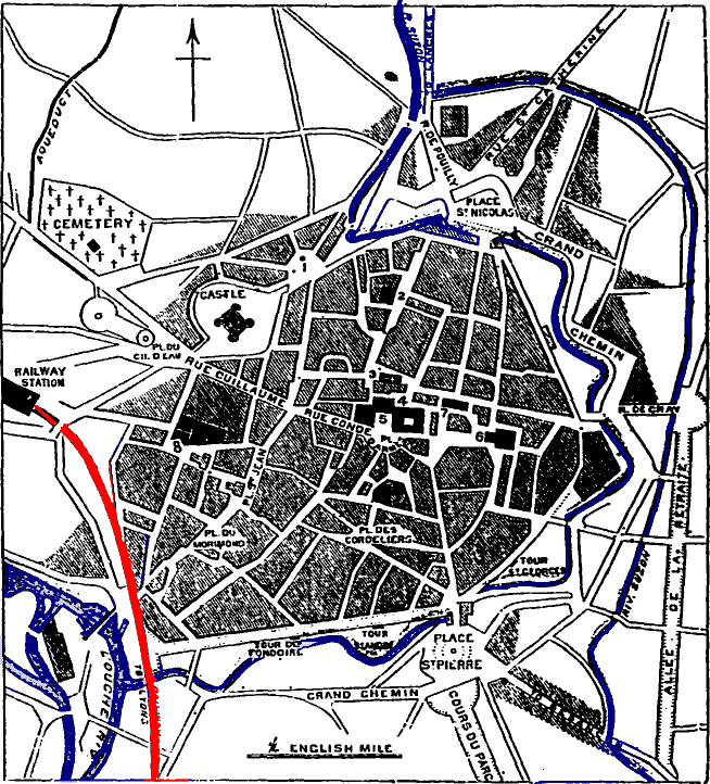 From Dieppe another line goes to Paris by Arques, Neufchâtel, Serqueux, Forges-les-Eaux, Gournay, Gisors, and Pontoise. Distance, 105 miles. Time by ordinary trains, 5 hours 10 minutes. Fares—1st class, 21 frs.; 2d, 15½ frs.; 3d, 11¼ frs. Arrives at the St. Lazare station of the Chemins de Fer de l’Ouest.