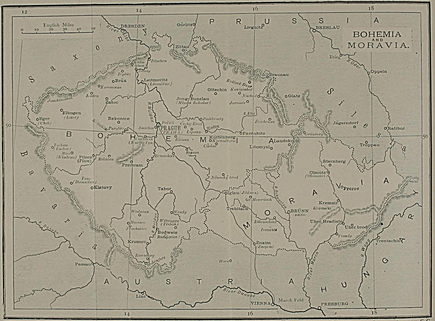 The question of when and how far to use the Bohemian names of places is one of some difficulty. My own instinct would be to use them wherever possible. But it cannot be denied that there are cases in which the German forms are so well known to English readers, and some in which the Bohemian names seem so unpronounceable, that it would be affectation to follow the strict rules of national expression. Praha, of course, has been hopelessly Anglicized into Prague; and Olomouci, Cheb, Brno, and Plz̆en have been as certainly Germanised into Olmütz, Eger, Brünn, and Pilsen. Even in these cases I have on some occasions added the Bohemian[x] names in brackets. But it was so difficult to know what names of Bohemian towns are generally known in England, that I may sometimes seem to have been inconsistent in my practice. Only let me assure my readers that my wish has been to impress on them the distinctive character of the Bohemian language, and at the same time to secure the recognition of any places with whose names they are already familiar.
