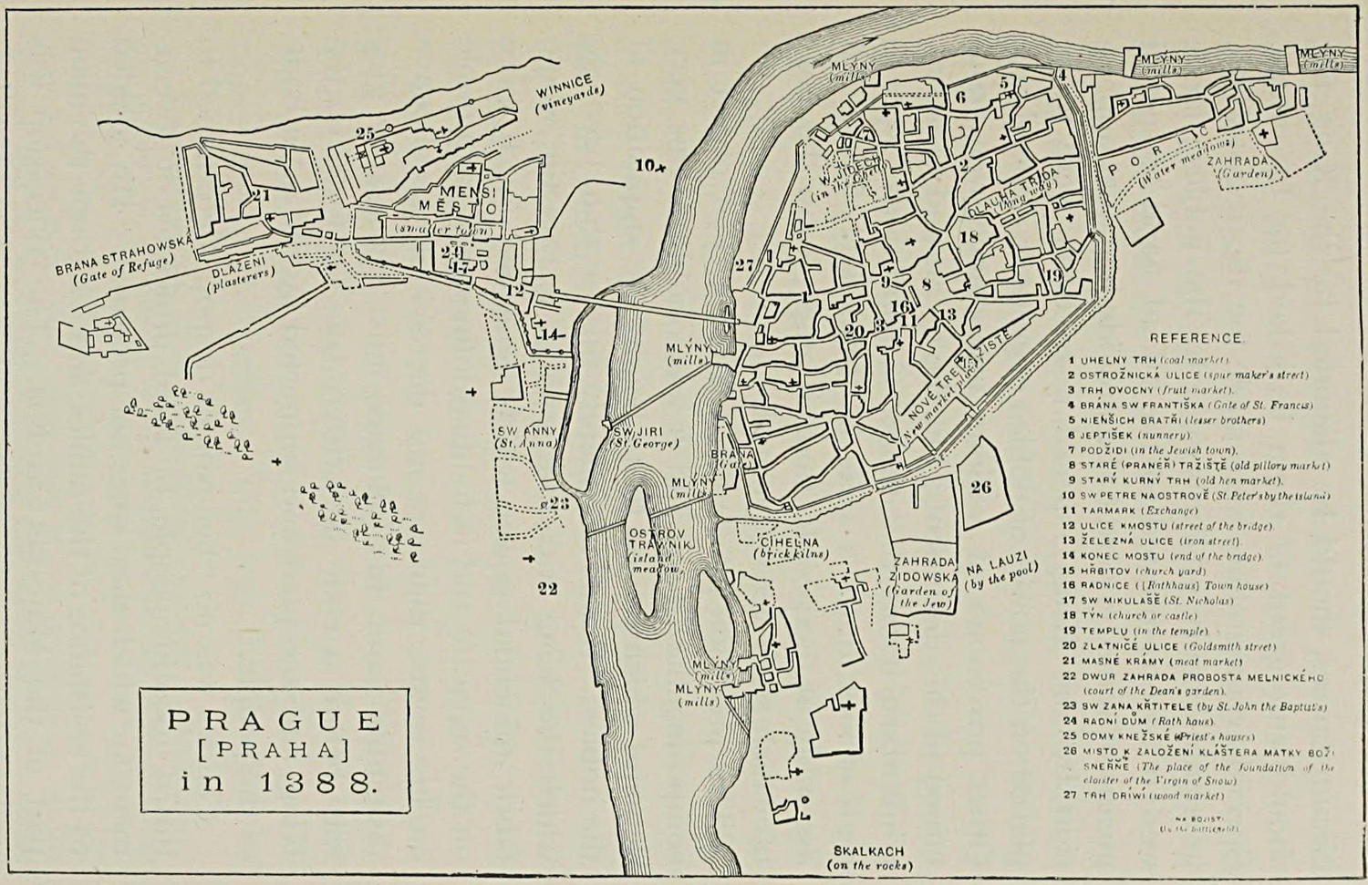 I have now to thank the many kind friends who have helped me in my work. Of these the chief helper has been Professor Mourek. During the whole of my stay at Prague I received every assistance from him which a foreigner studying in that town could possibly require; and since I have returned to England he has helped me most energetically in procuring various illustrations necessary for my book. I have also to thank Count Leo Thun (the cousin of the late Governor of Bohemia) for many useful hints and introductions. I should also thank Mr. Custos Borovsky, of the Rudolfinum, for the kindness with which he supplied me with introductions during my visits to other towns in Bohemia and Moravia. I should also thank Professor Rez̆ek for many useful hints, especially about the difficult reign of Ferdinand[ix] I. Professor Kalausek I have to thank for hints about the earlier period. Professor Tomek I must thank for allowing me to use the map of Prague which appears in my book. I must also thank Dr. Toman for the use of the curious pictures of Z̆iz̆ka. For help in my work in other towns I must thank Father Wurm, of Olmütz (Olomouci); Mr. Palliardi, of Znaym (Znojem); Professor Brettholz, of Brünn (Brno); the Sub-librarian of C̆aslau; Professor Lemminger, of Kuttenberg (Kutna Hora); Mr. Gross, of Krumov; Father Fuc̆ik, of Prachatice; Professor Strnad, of Pilsen (Plz̆en); Monsignore Rodler, of Budweis (Budejóvice); the Keeper of the Archives at Wittingau (Tr̆ebon̆), and Professor Sedlac̆ek, of Tabor. I also wish to thank Mr. C̆elakovsky, of the Town Archives of Prague, for the suggestion about the relation of the early Utraquist rising to the differences between Bohemian workmen and German employers (see Chap. ix. pp. 231, 232).