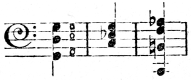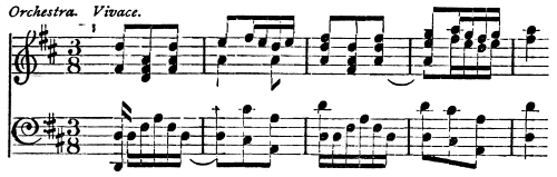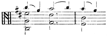 [79] M. Vivien, a pupil of Léonard, and one of the first violins in the orchestra at Brussels about 1876, had a violin of which the bridge was cut nearly flat at the top. This enabled him to play on three and (with a little extra pressure of the bow) four strings at once, by which he produced very full effects.