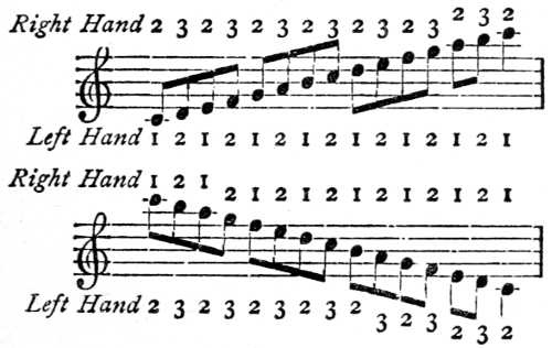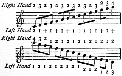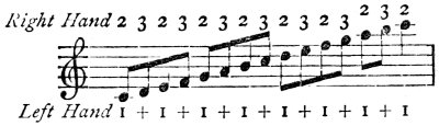 [77] In “The Compleat Tutor for the Harpsichord or Spinnet, wherein is shown the Italian manner of Fingering, &c.” by S. and S. Thompson, the date of which is later than 1742, since it contains the minuet in Samson, the little finger is never used in a scale, and fingers are made to go under one another, in the way the thumb is used nowadays. The English numbering is used; and the example of an ascending and descending scale on p. 153 shows the chaotic condition of things.