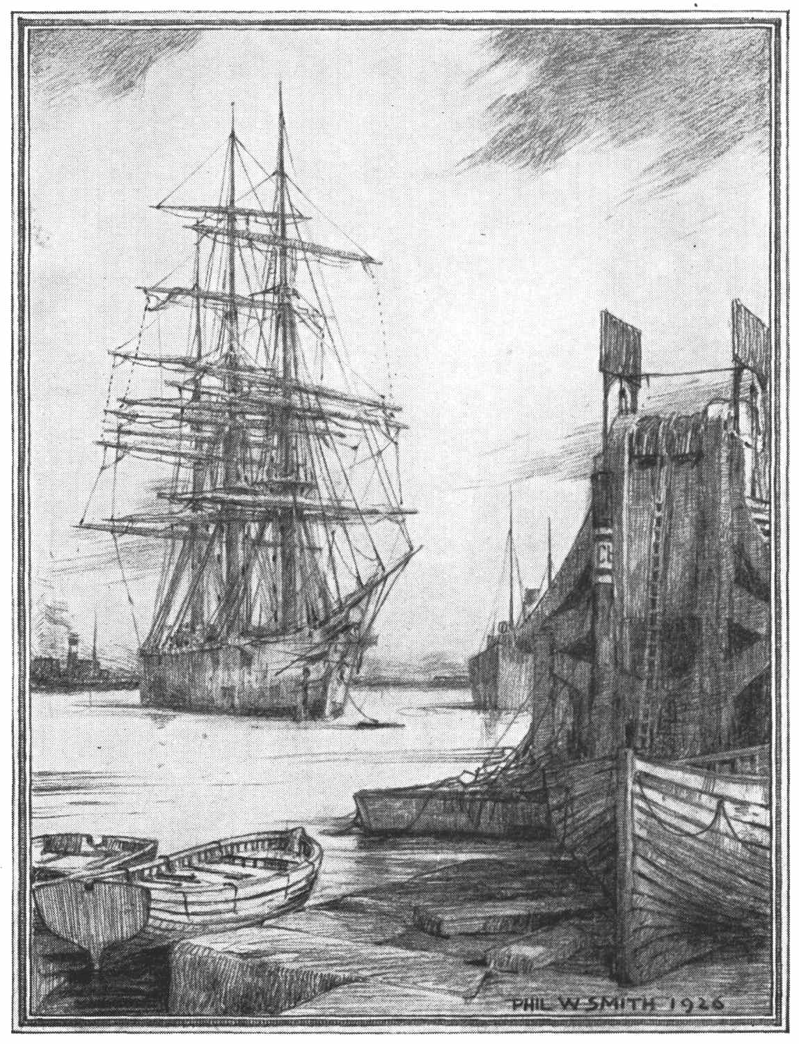 He found the “Philopena” in a derelict, melancholy wet dock somewhere among vacant lots and chemical works down in the Isle of Dogs, along with a couple of dilapidated coasting colliers and a broken-down tug—a smoky Thames-side sunset burning like a banked fire behind the cynical-looking sheds of a shadowy and problematical Griffin—and he fell in love with her on the instant.
