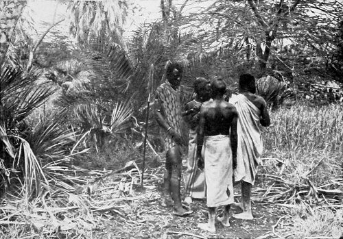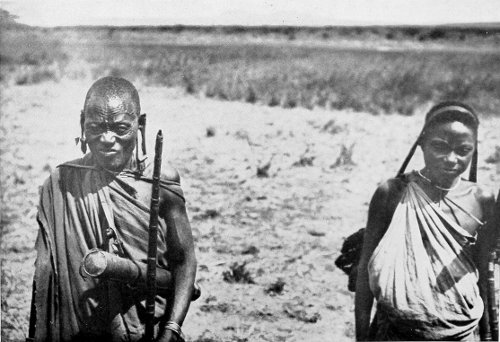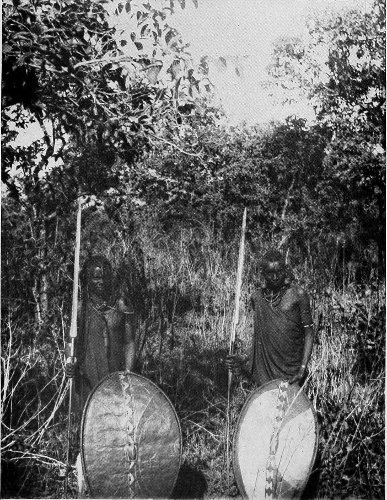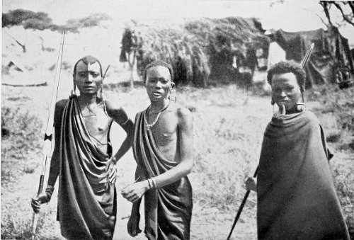 MASAI ol’ morani AND TWO YOUNGER MASAI IN MY CAMP. THE TYPICAL COSTUME OF THE WARRIOR DIFFERS CONSIDERABLY FROM THAT SHOWN IN THE ILLUSTRATION AT THE END OF THE CHAPTER, WHICH REPRESENTS A MASAI ALREADY INFLUENCED BY CIVILISATION.