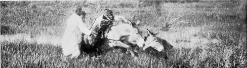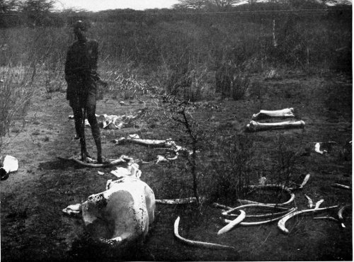 In the lapse of little more than a year the cattle plague and the Black Death had swept over the Masai uplands. Hungry vultures hovered over scenes of horror. The herds of cattle fell under the strange pestilence. Agonised by slow starvation, the herdsmen followed them to death. I have often found lying together, in one narrow space, the countless white bleached bones of the cattle and the skull of their former owner. It would be an old camping-ground, with its fence of thorns (zereba) long rotted away, and it was now a strangely impressive Golgotha. These heaps of bones, still to be seen in 1897, were soon after dissolved in dust and scattered by the winds.