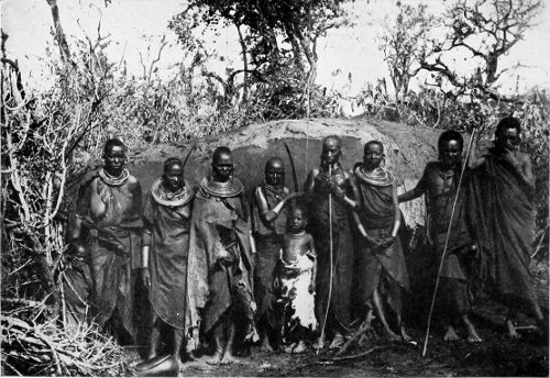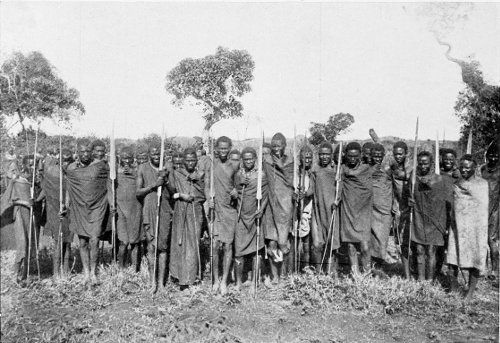 MASAI WARRIORS, ARMED WITH THE LONG SPEARS WHICH HAVE COME INTO USE WITH THEM DURING THE LAST GENERATION OR TWO. IN FORMER DAYS, ACCORDING TO HOLLIS, THEY USED SPEARS WITH SHORTER BLADES.