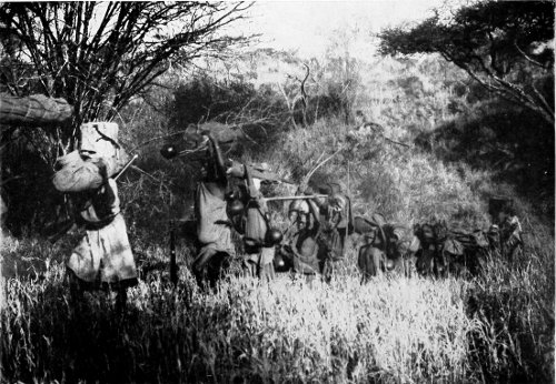 BEARERS ON THE MARCH. THE FIGURE ON THE RIGHT IS AN ILLUSTRATION OF THE WAY IN WHICH THEY SOMETIMES RELIEVE THE STRAIN ON THEIR SHOULDERS BY CARRYING THEIR LOAD AT ARMS’ LENGTH OVER THEIR HEAD. A HUNDRED PACES A MINUTE IS AN AVERAGE RATE FOR A HEAVILY LADEN BEARER.