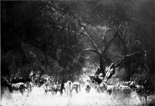 Now at last the lion raises his commanding voice, and one thing only is wanting to the whole nocturnal spell—the noisy trampling of timid and harassed droves of zebras and other herds of wild things. But if the ground of the velt, hardened by the burning sun, rings once more to the thundering hoof-beats of the zebras, the eye fails in the darkness, and only our ears perceive by their numberless sounds the waves of life that are surging around us; and then indeed the listener comes to full 318 consciousness of how rich the animal-language of the Nyíka still is.... Nowhere else in the world of to-day do all the voices of the wild resound more impressively, and for him who listens to this language there is no escape from that mysterious spell—the Spell of the Elelescho!