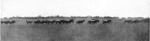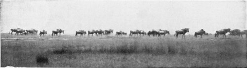 Darker spots in the distance far away from us we take to be larger wild animals. The field-glass shows that they are hartebeests, and a great number of waterbuck; and still farther off there is a moving mass that shimmers and is half lost in the glare of the morning sun. There are zebras, and yet more zebras, moving like living walls! Strange effects of light actually give us the impression of something like a wall or rampart, made up of the living forms of the zebras—the deep shadows they throw come out black, their flanks are lighted up in the dazzling sunshine, and they shimmer with all colours and with ever-changing effect.