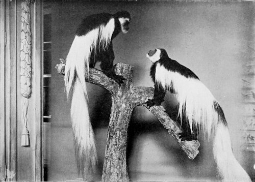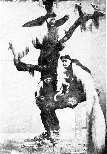 But now there suddenly breaks forth a remarkable sound, rising and again falling as I listen, a strange music of a most peculiar kind. It is the chatter of the colobus monkeys, a sound that cannot be described in words. 295 A party of these wonderful creatures seems to be in good humour, for their song comes to me in chorus unceasingly, and in rising strength. “Murúh-murúh-murúh-rrrrrrmúh rrrrrrmúh-murúh quoi-quo-quo-quo-rrrr,” it sounds, now swelling strongly out, now gently dying away. These, too, are doomed to death, who now are letting us hear their primitive song, that in our days may so easily be their death-song; for these monkeys are keenly hunted for the sake of their beautiful fur, and their song often betrays them to the hunter, eager for their spoils. Some poisoned darts, which I find here with points as sharp as needles, and which were once shot with a bad aim at the little monkeys, are evidence enough of this.