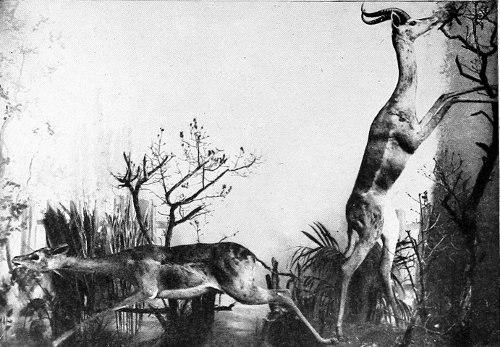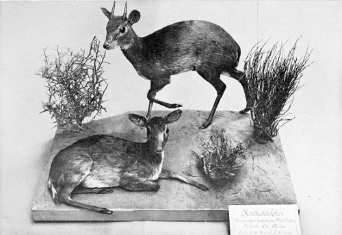 Far away extended the panorama of the lake, which lay before us filling its hollow bed, with its banks at this season of the year yielding fresh pastures to numberless herds of wild animals, and its waters affording rest and food to countless members of the feathered tribe. I had hardly ever seen greater numbers of the pretty little dwarf gazelles (Gazella thomsoni, Gthr.). Thousands and thousands more of these graceful creatures showed themselves on the fresh, green, grassy meadows of the lake margin, or scattered over its pebble beds of obsidian, augite, and pumice-stone. Wherever one turned one’s gaze it fell again and again upon these beautiful gazelles, which in many ways reminded one of wild goats at pasture, and were so strangely trustful that they often allowed the spectator to come quite close to them. Marked as are the colours of its hairy covering, the dwarf gazelle does not stand out boldly from the background, whether this be a plain blackened by bush-fires, 20 or the mere bare ground, dun-coloured and brown, or land covered with soft green grass. But how clearly defined are its brown, black, and white, when we look closely at the hide of a specimen we have secured, or see it in a museum.