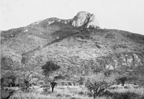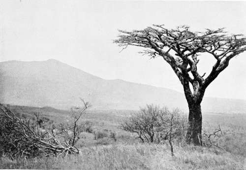 Before me is a miniature mountain-world lighted up by the dazzling sunbeams. There is a mass of precipitous rocks, so characteristic of the Masai-Nyíka district, that stretches away into the distance. The Candelabra Euphorbias spread out their strange forms against the light, in grotesque clumps, and seem to me to make 300 themselves one with the rocks, whose inorganic character and nature appear to be repeated in their characteristic forms.