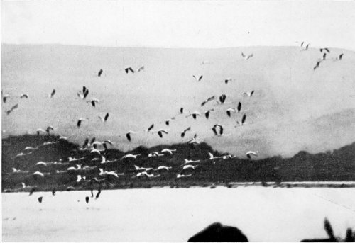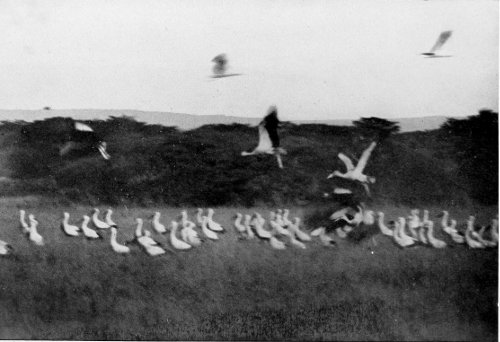 Amongst the herds of zebras our European stork 29 30 31 together with its smaller African cousin, the Abdim stork, is stalking in hundreds over the plain hunting for locusts. In company with the storks I saw also great flocks of the handsome crested crane engaged in the same occupation. Or they rose in heavy flocks over the valleys with loud and strangely discordant cries. Under the scanty shadows of the mimosas the splendid giant bustards take their stand at midday, erect, solemn, stiff-necked. At this time they are not very wary, but in the coolness of the morning and in the evening hours they soon get away to a safe distance, either running with their quick mincing step, or spreading their strong pinions for a short flight along the ground. Their smaller relative, Otis gindiana, Oust., rose before me in the air, often throwing somersaults on the wing like a tumbler pigeon. There is hardly any other bird of its size that has such a mastery of flight. Sea-eagles circled by the margin of the lake uttering their beautiful clear-sounding cries. Heedless of their presence thousands of splendid rose-red flamingoes soared up into the deep blue dome of the sky, or lined the margin of Nakuro, like a garland of living lake-roses, in company with great flocks of ducks, geese, and waterside birds of many kinds. Out of the clumps of acacias, and from between the thickets of ‘msuaki bush by the lake, guinea fowl and francolins rise, strung out in clattering flying lines, and in the morning hours handsome sandfowl that have come from far-off regions of the plateau sail by the margin of the lake. Altogether an overwhelmingly rich picture of warmly pulsating life and activity! The sight of it all is indeed quite capable of impressing one with 32 the idea of flocks of wild creatures that have been completely tamed; and once this idea has suggested itself, the impression is so strong that for many minutes one can believe in it!