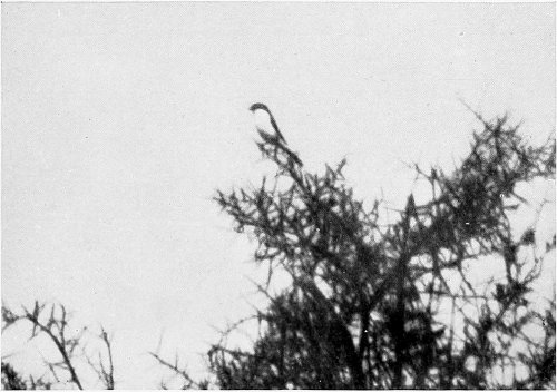 A SHRIKE (LANIUS CAUDATUS, Cab.) ON THE LOOK-OUT FROM THE HIGH BOUGHS OF AN ACACIA. ITS CRIES WHEN IT SEES A HUNTER ON THE MOVE OFTEN WARN THE ANIMALS HE IS STALKING.