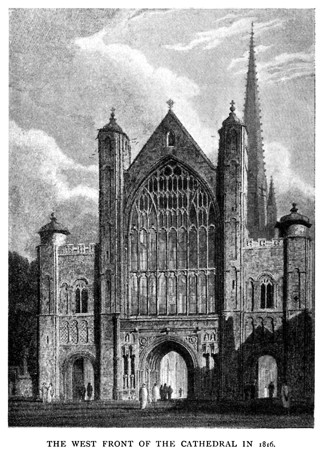 His successor, Alnwick, completed the cloisters. The gateway to the palace was built by him about 1430, and probably replaced an earlier structure. He also began the work of remodelling the central compartment of the west front. He left directions in his will to his executors to make a large west window, the cost to be charged to his estate. The doorway [18]under this window, built over the old Norman one, and encroaching on the side arcading, was executed during his episcopate, the window being eventually added during the time of Bishop Lyhart to throw additional light on to the vault he erected, and its wonderful sculptures.