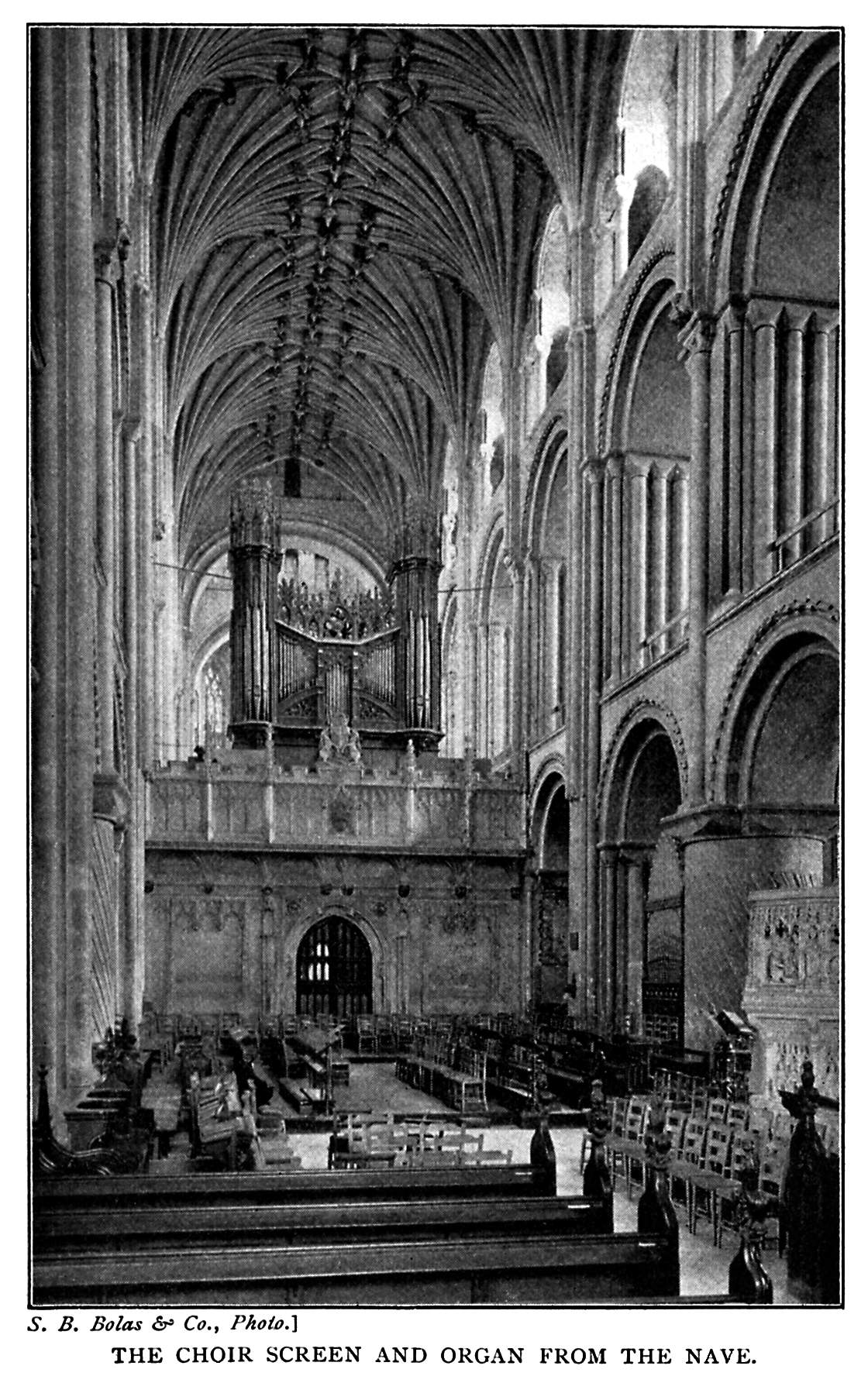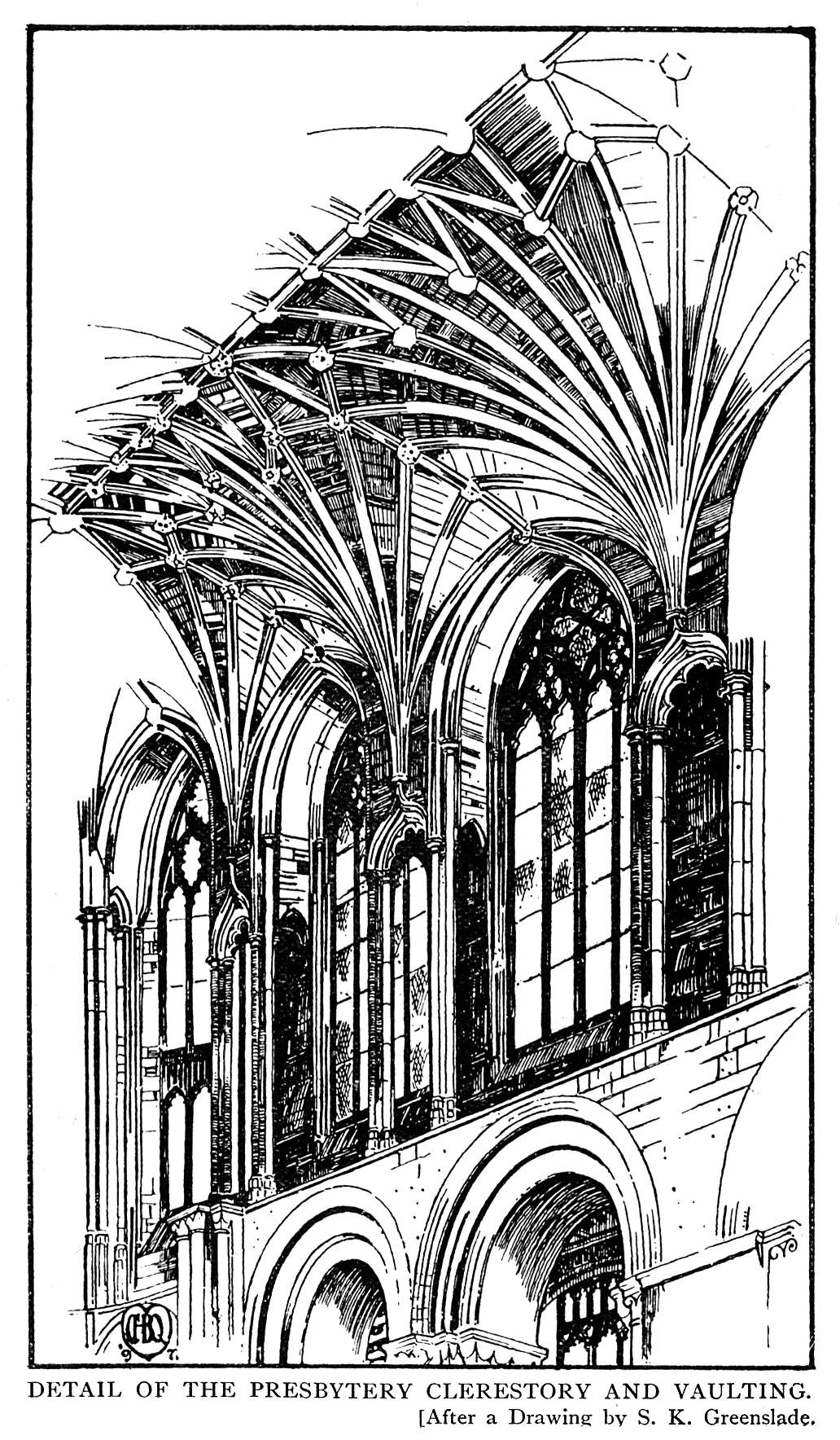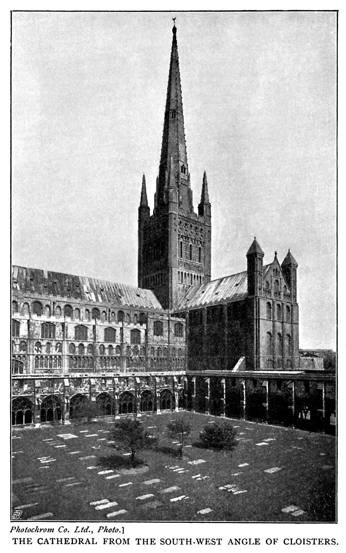 I would here acknowledge indebtedness and thanks due to the Very Rev. the Dean and Mrs Sheepshanks for the personal interest they evinced, and for his material help; to Mr J.B. Spencer, the sub-sacrist, for that help which his intimate association with the cathedral enabled him to offer; and to Mr S.K. Greenslade for the loan of the drawings reproduced under his name; as well as to the Photochrom Co. Ltd., Messrs S.B. Bolas & Co., and Mr F.G.M. Beaumont for the use of their photographs. The views of the cathedral as it appeared in the early part of the nineteenth century are reproduced from Britton's "Norwich," and from a volume by Charles Wild.