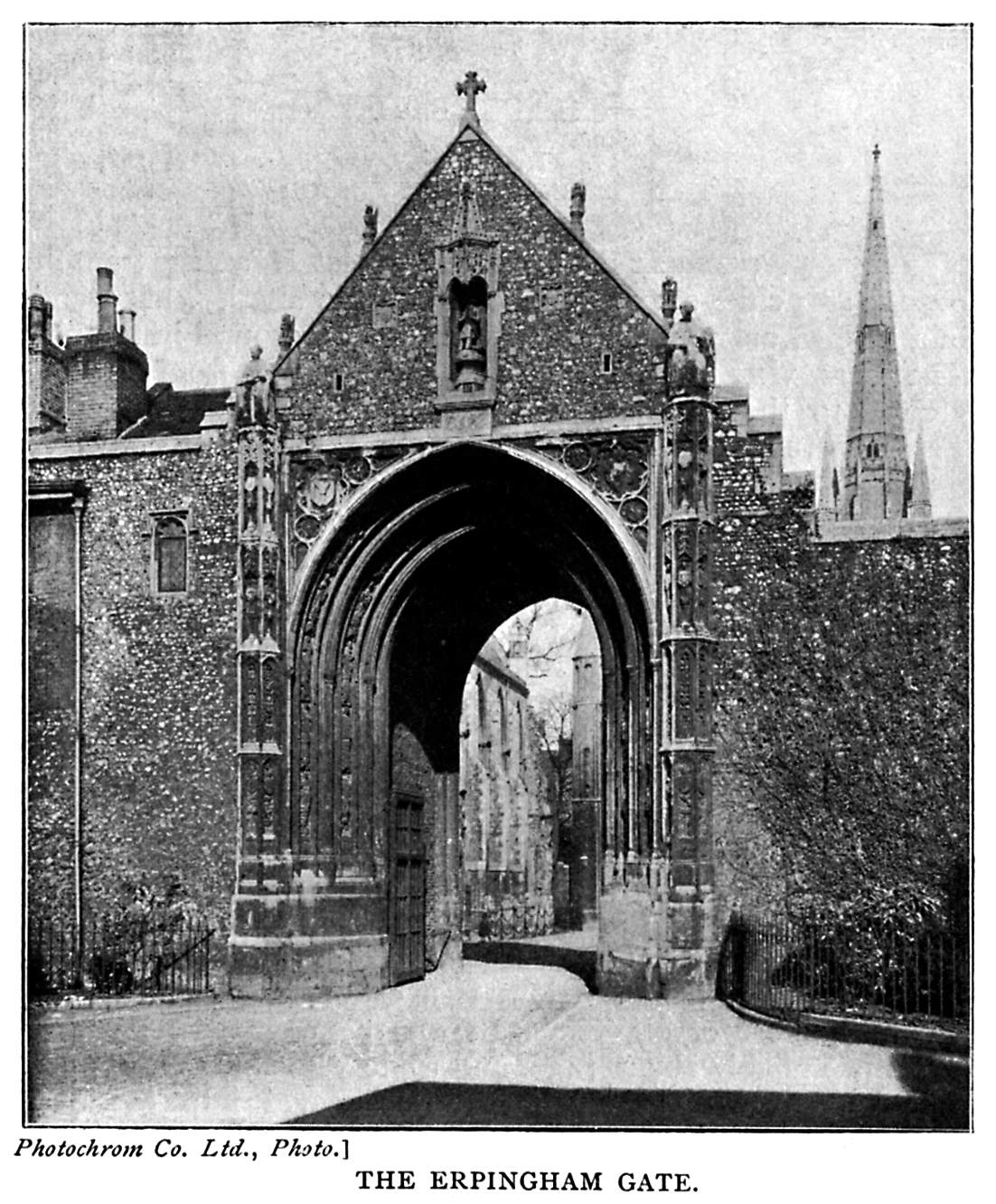 The Cathedral Precincts, or Close, running from Tombland eastward to the river, are entered by two gates to the precincts and one to the bishop's palace.